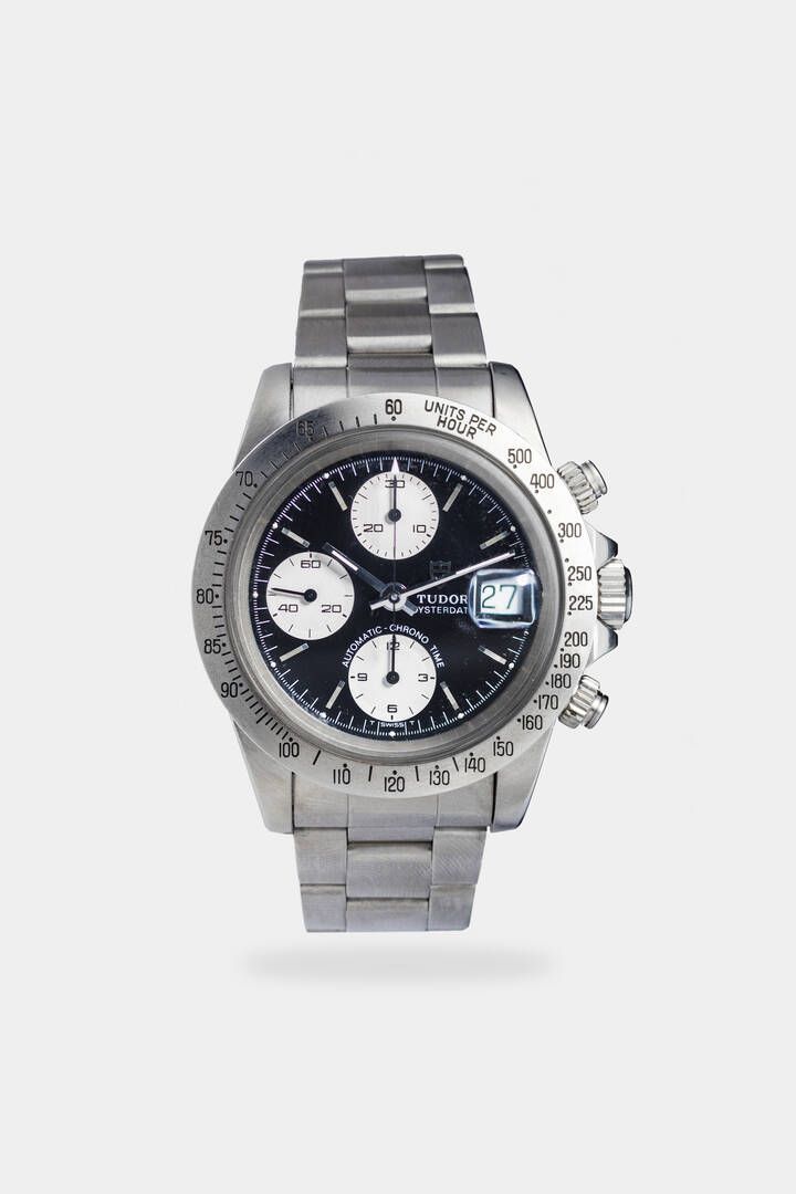 TUDOR Mod. Oyster Date Big Block, ref.79180, anno 1992 Diam. 40 mm Cassa in acciaio con lunetta tachimetrica incisa, fondello a vite marchiato Rolex e corona di carica loggata Rolex. Quadrante nero con indici geometrici applicati e contatori a contrasto color argento. Il dial presenta ad ore 12 il contatore dei 30 minuti, al 9 quello dei secondi continui al 6 quello delle 12 ore ed al 3 troviamo la finestrella del datario. Bracciale in acciaio Oyster con ref.78360 con chiusura clasp coeva. Movimento a carica automatica Valjoux cal 7750. Completo di scatola e garanzia traforata.