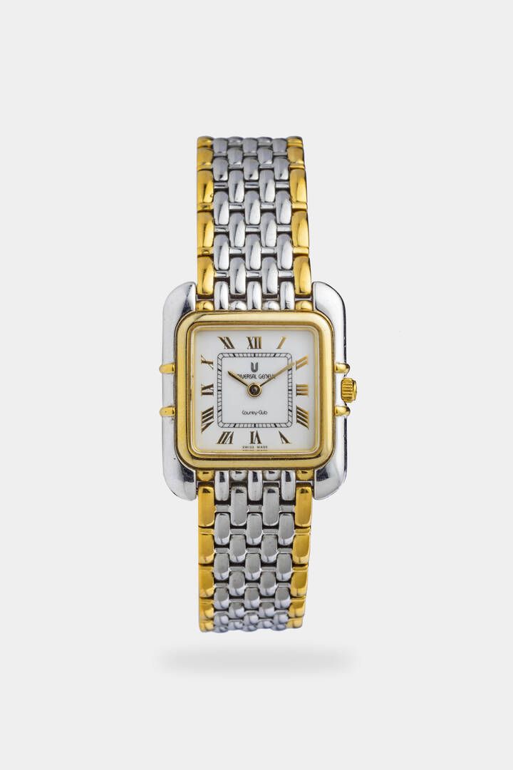 Cassa in acciaio con lunetta dorata. Quadrante bianco con numeri romani applicati. Bracciale in acciaio e doratura con chiusura a scomparsa.