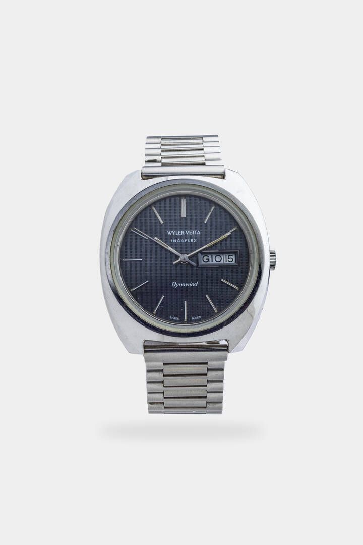 WYLER-VETTA Mod. Dynawind, ref.27890588, anni '90 Diam. 37 mm Cassa in acciaio con fondello a vite. Quadrante grigio effetto Lino con datario al 3 ed indici geometrici applicati. Bracciale non firmato in acciaio integrato con chiusura clasp. Movimento a carica automatica cal.2789.