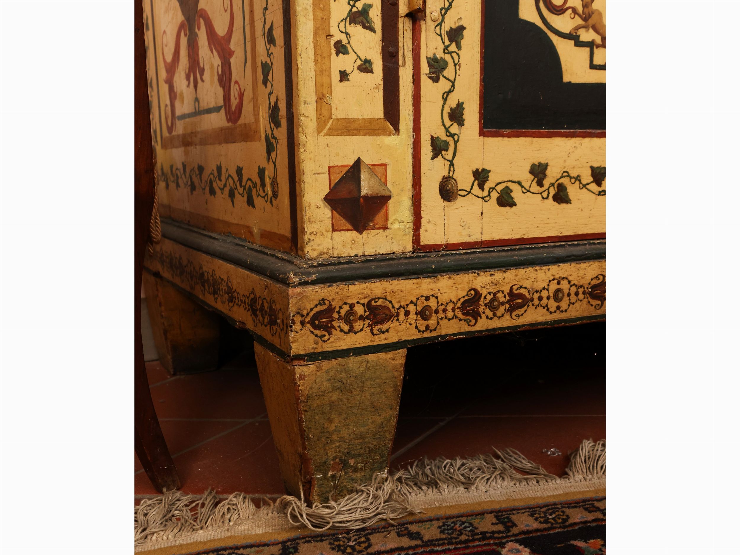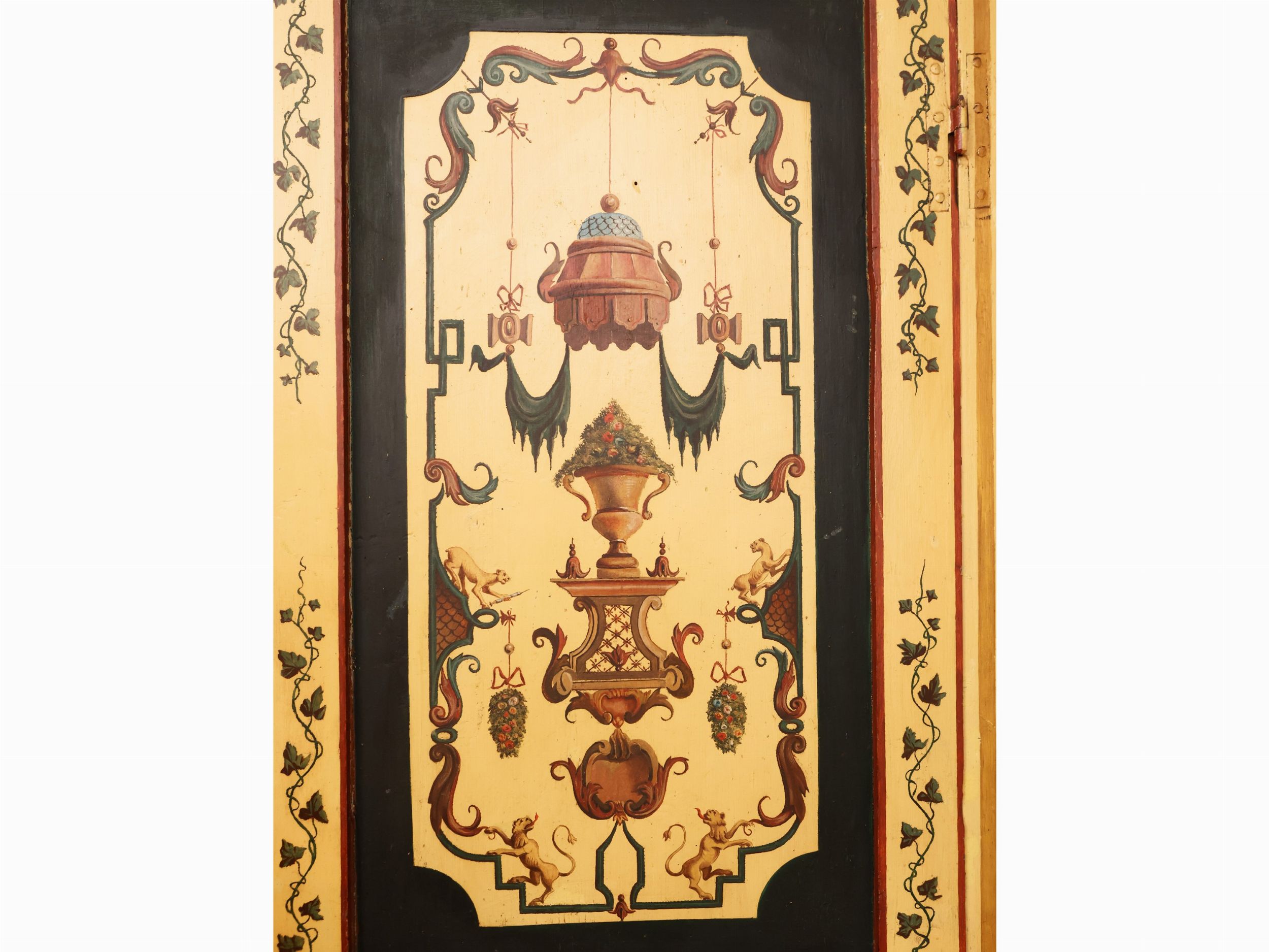 XIX secolo interamente dipinto a raffaellesche policrome su fondo color crema, bordure decorate con ghirlande di foglie di edera, due sportelli a doppia formella sul fronte dritto, piedi a faretra