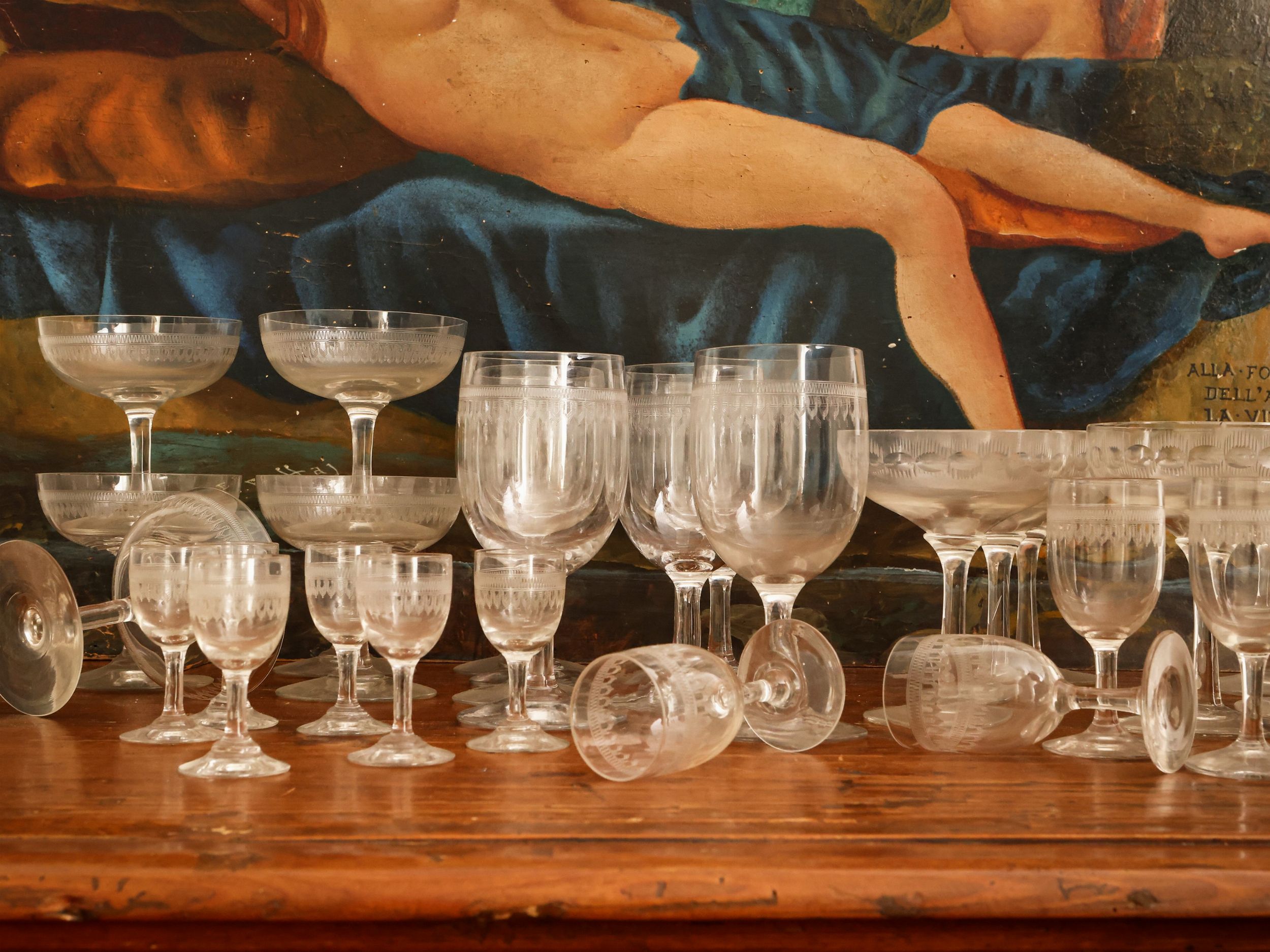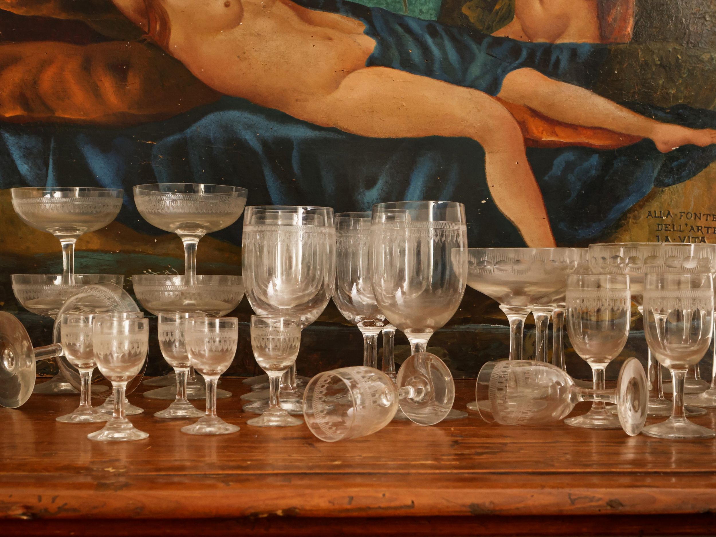 XX secolo composto da otto coppe da champagne in cristallo, otto bicchieri da vino, otto da liquore, otto piccoli calici da rosolio e sei coppe da champagne in vetro serigrafato (40)
