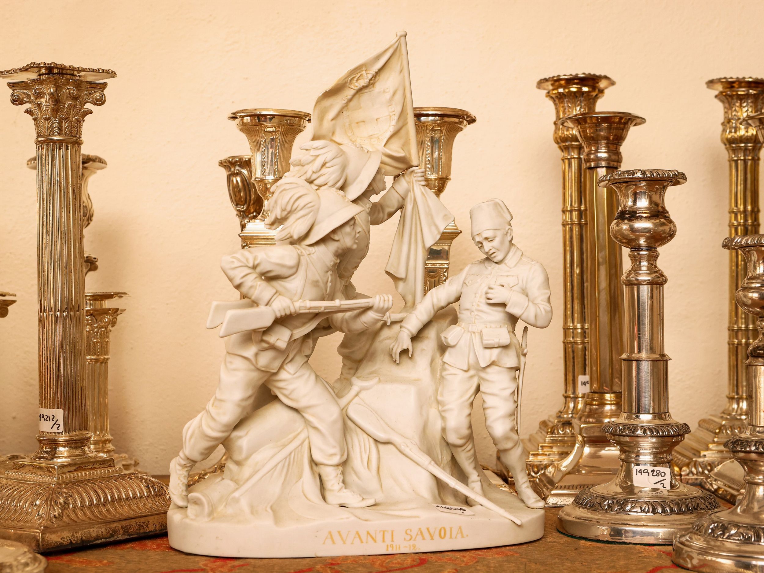 inizio del XX secolo gruppo in biscuit raffigurante Bersaglieri impegnati nella Guerra di Libia, in basso reca iscrizione Avanti Savoia 1911-12