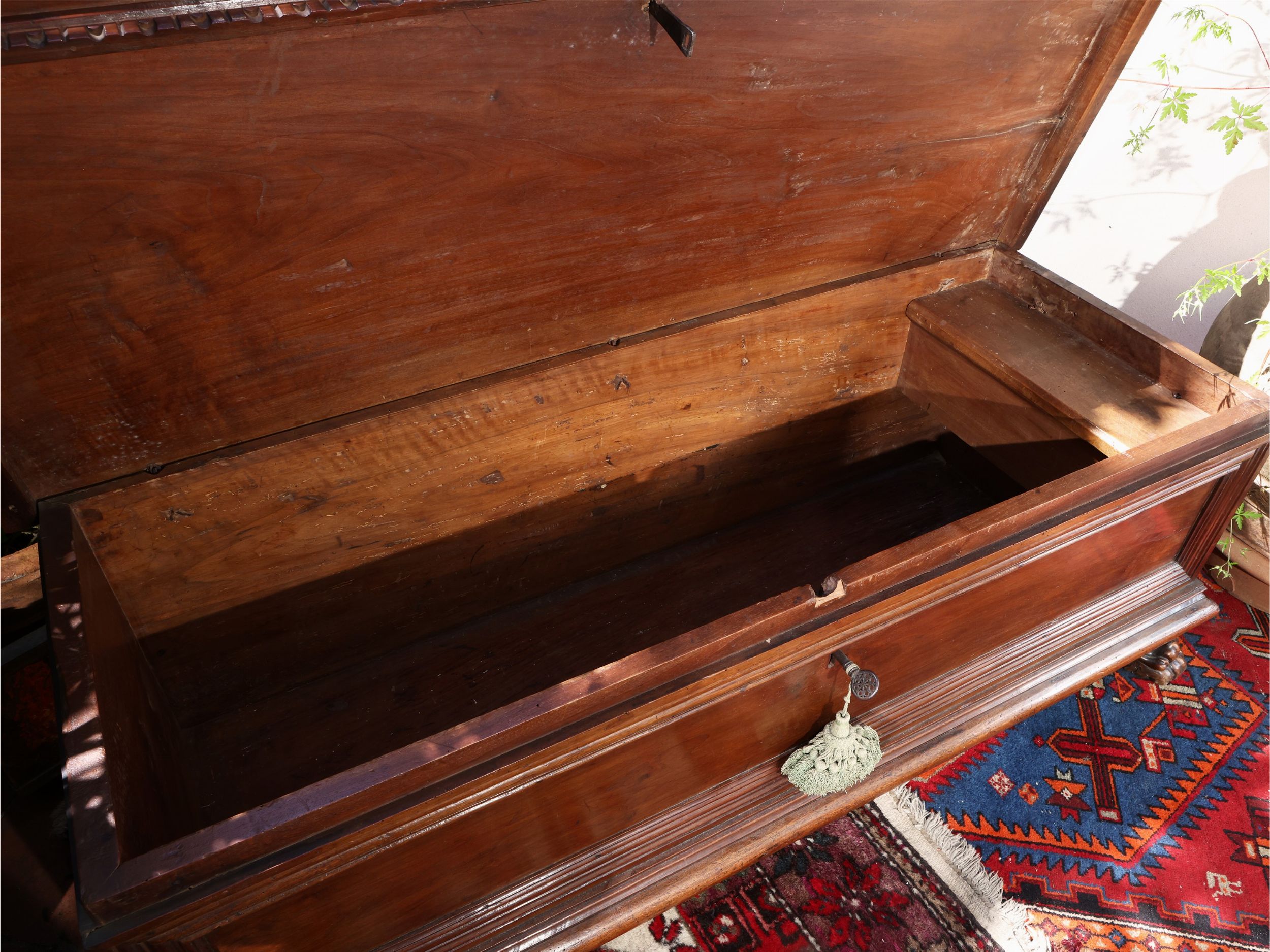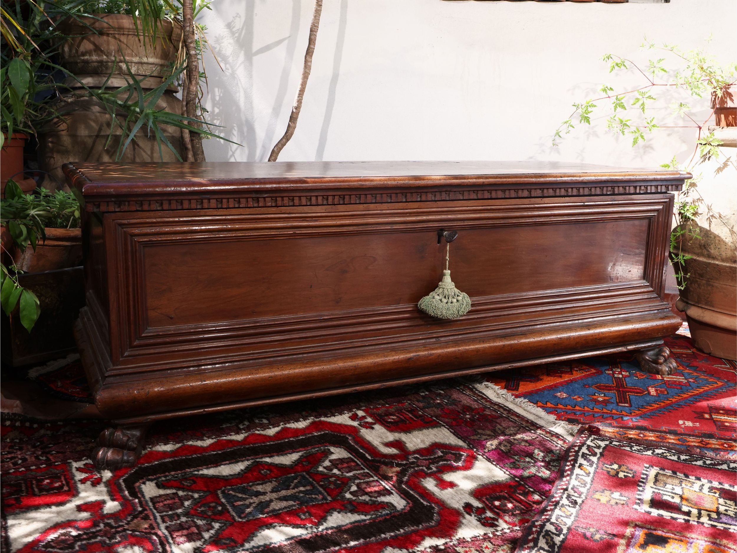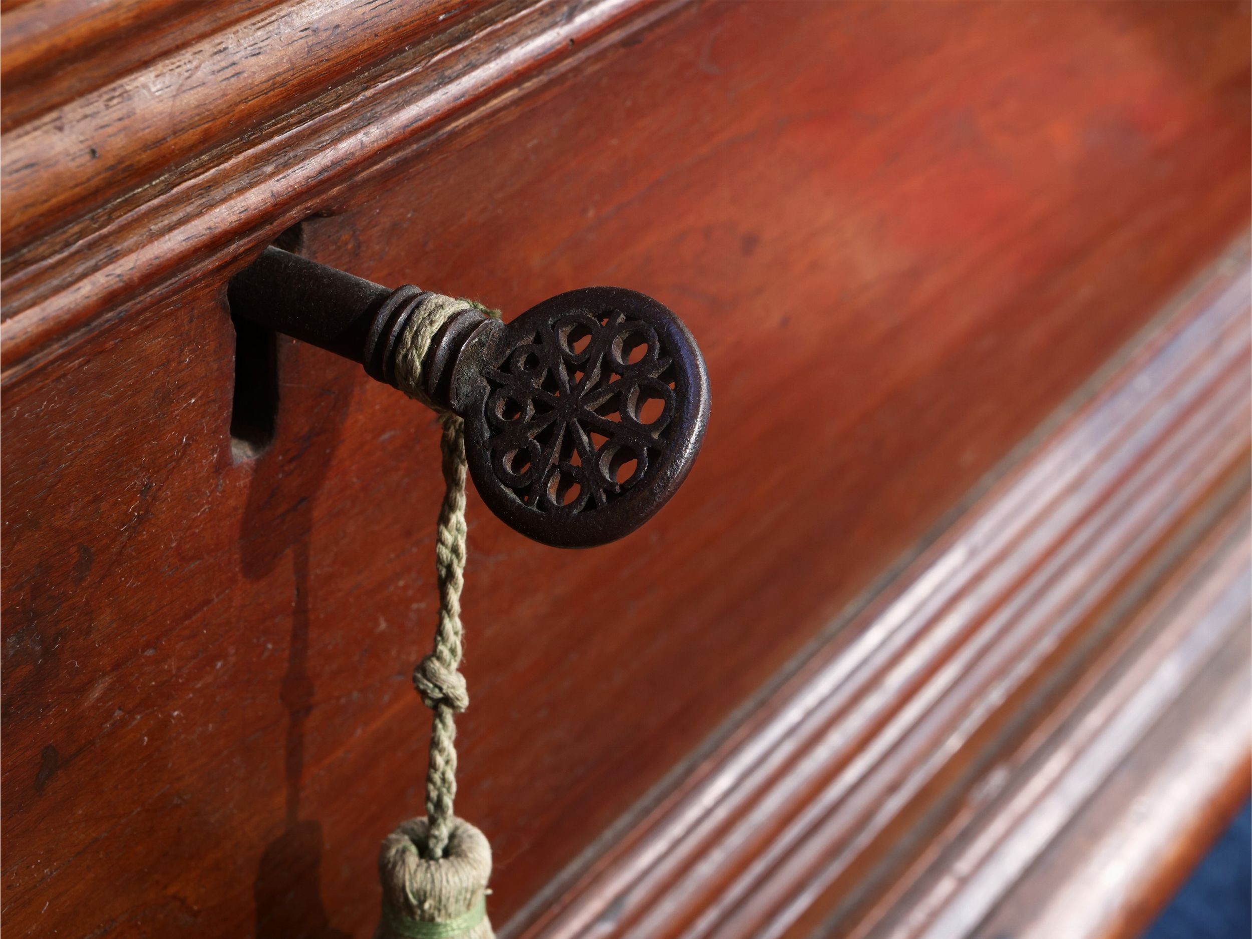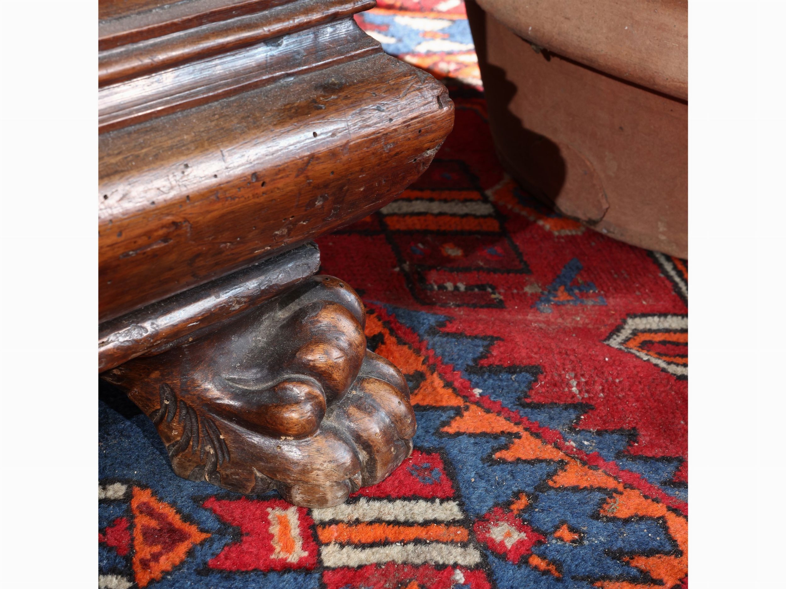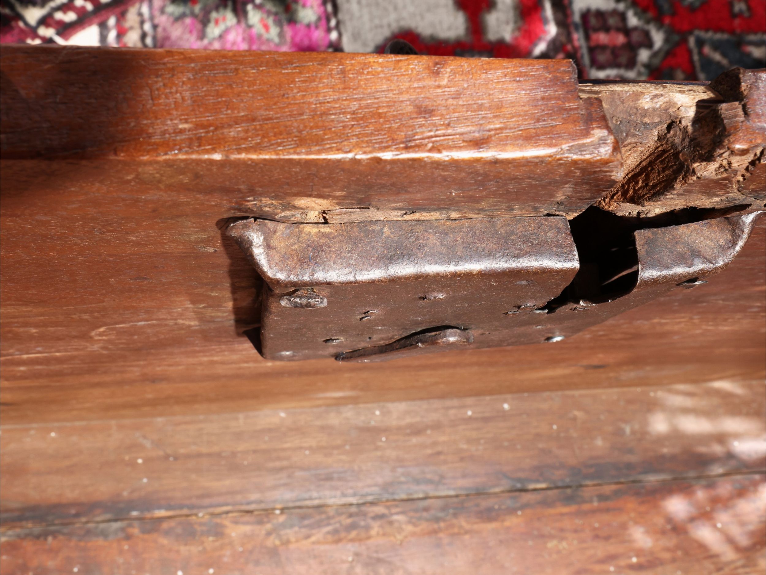 XVIII secolo coperchio con bordo a becco di civetta con gocciolatoio sottostante, base con ampio bordo ad urna aggettante, piedi ferini, bella chiave in ferro battuto, alcuni restauri