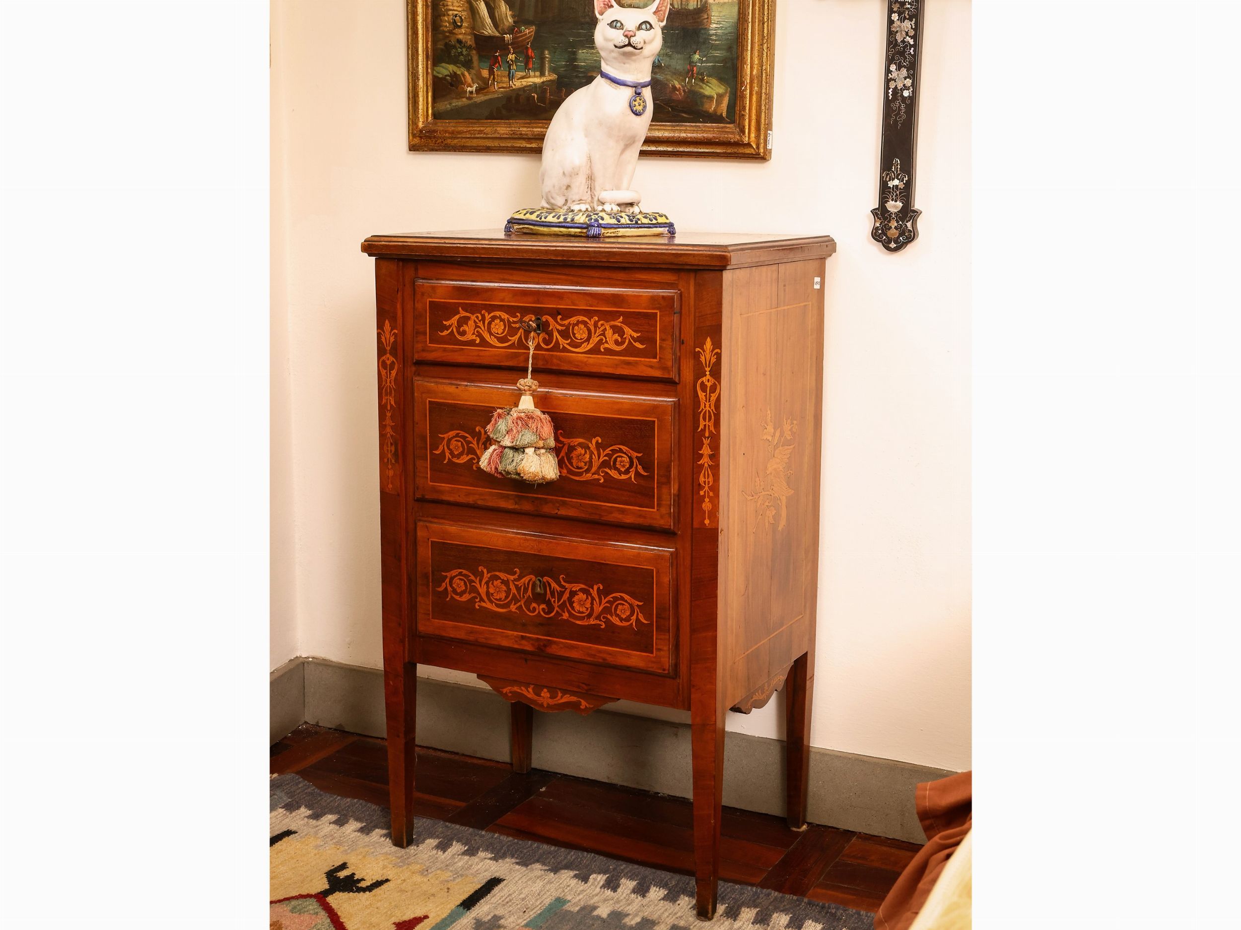 XIX secolo interamente intarsiato con motivi floreali e volatili in legni di frutto, tre cassetti sul fronte dritto, gambe a faretra