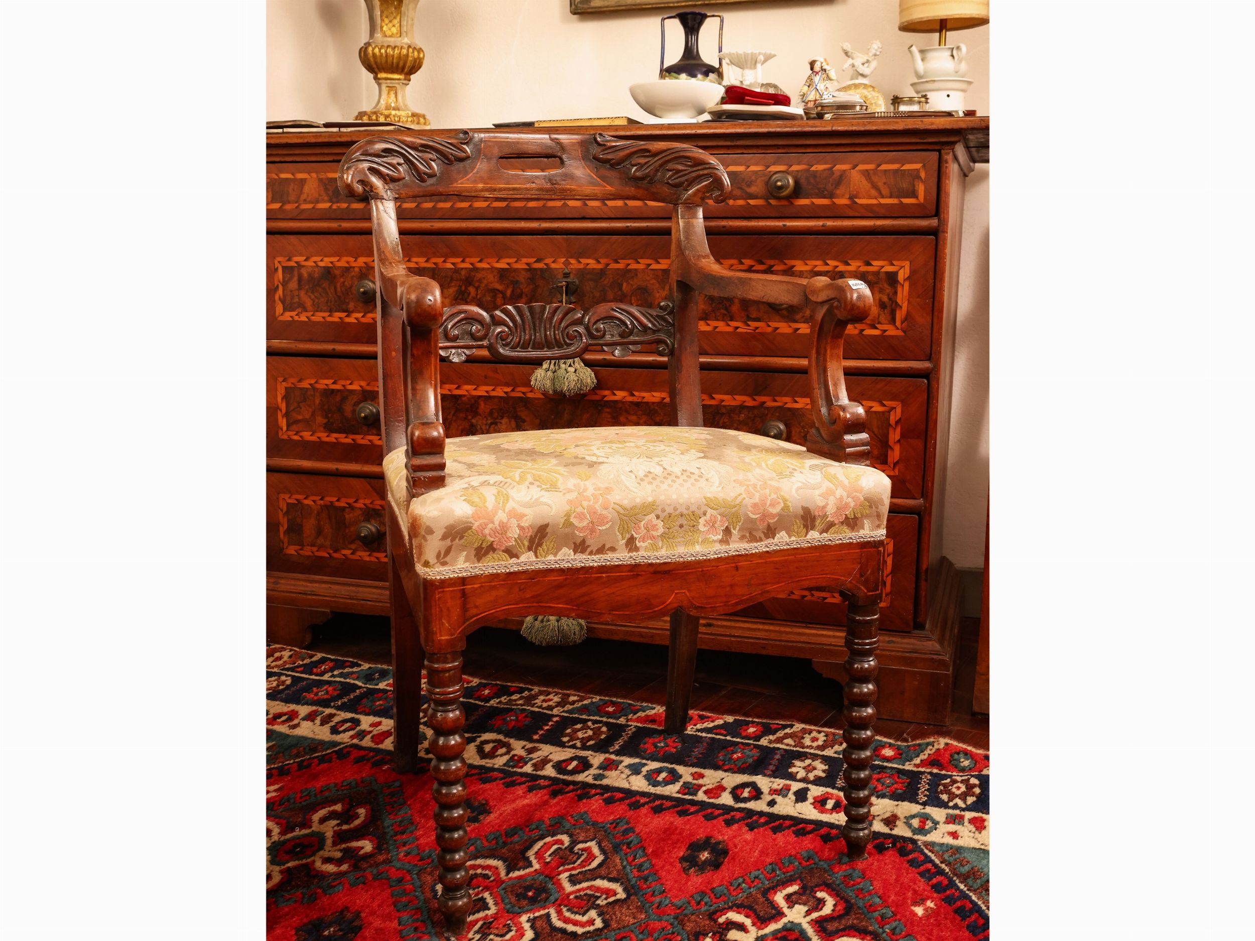 h cm 80x70x70 metà del XIX secolo intarsiate con filettature in legni di frutto, schienale intagliato con motivo a foglie d'acanto, gambe anteriori intagliate con motivi globulari sovrapposti, le posteriori a sciabola, sedili rivestiti in damasco nei toni pastello