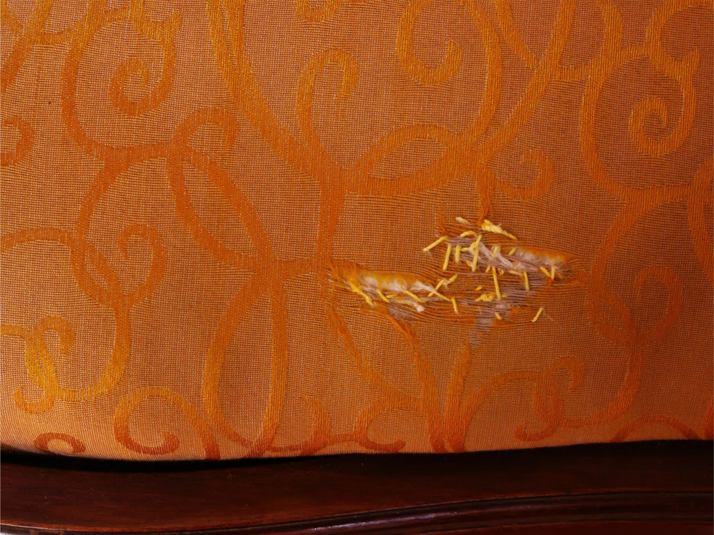 h cm 100 Inghilterra, XIX secolo schienale sagomato con cartella traforata a stecche intagliata con motivo di spighe, braccioli a giorno, gambe anteriori a faretra, riunite alle posteriori a sciabola da traversa ad H, sedile rivestito in tessuto damascato nei toni del giallo, alcuni difetti