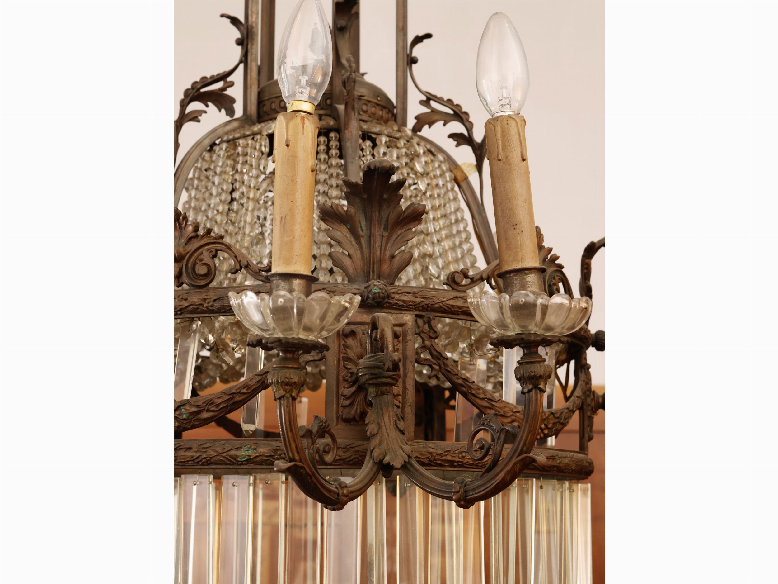 inizio del XX secolo realizzato a corona con motivi a festoni, cinque bracci doppi portacandele, altre cinque luci alla sommità, impreziosito da catene di perle in vetro e lunga frangia a nastri in cristallo, lievi difetti