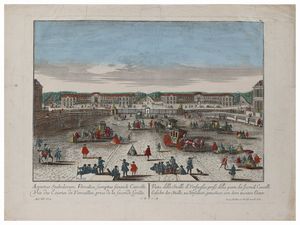 matrici cm 22x46 XVIII secolo Veue particuliere des Ecuries de Chantilli du coté du manege, Veue du grand Canal [..]