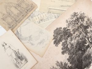 XIX/XX secolo raccolta di incisioni, litografie e bozzetti raffiguranti paesaggi e soggetti vari, tra cui alcuni [..]