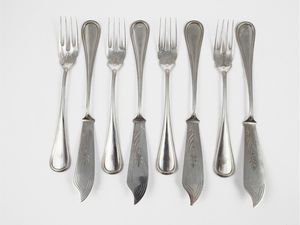 gr 1020 (23) Italia, inizio del XX secolo incise con motivi vegetali, composto da 12 forchette e 11 coltelli