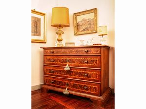 h cm 97x140x60 XVIII/XIX secolo quattro cassetti intarsiati in legni di frutto con doppia filettatura a spina [..]