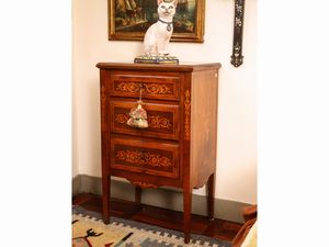 h cm 77x53x47 prima metà del XIX secolo lesene scantonate, tre cassetti sul fronte dritto, piedi sagomati, alcuni [..]
