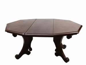h cm 80x125x66, prolunga cm 50x131 prima metà del XX secolo piani trapezoidali, due sostegni desinenti a voluta, [..]