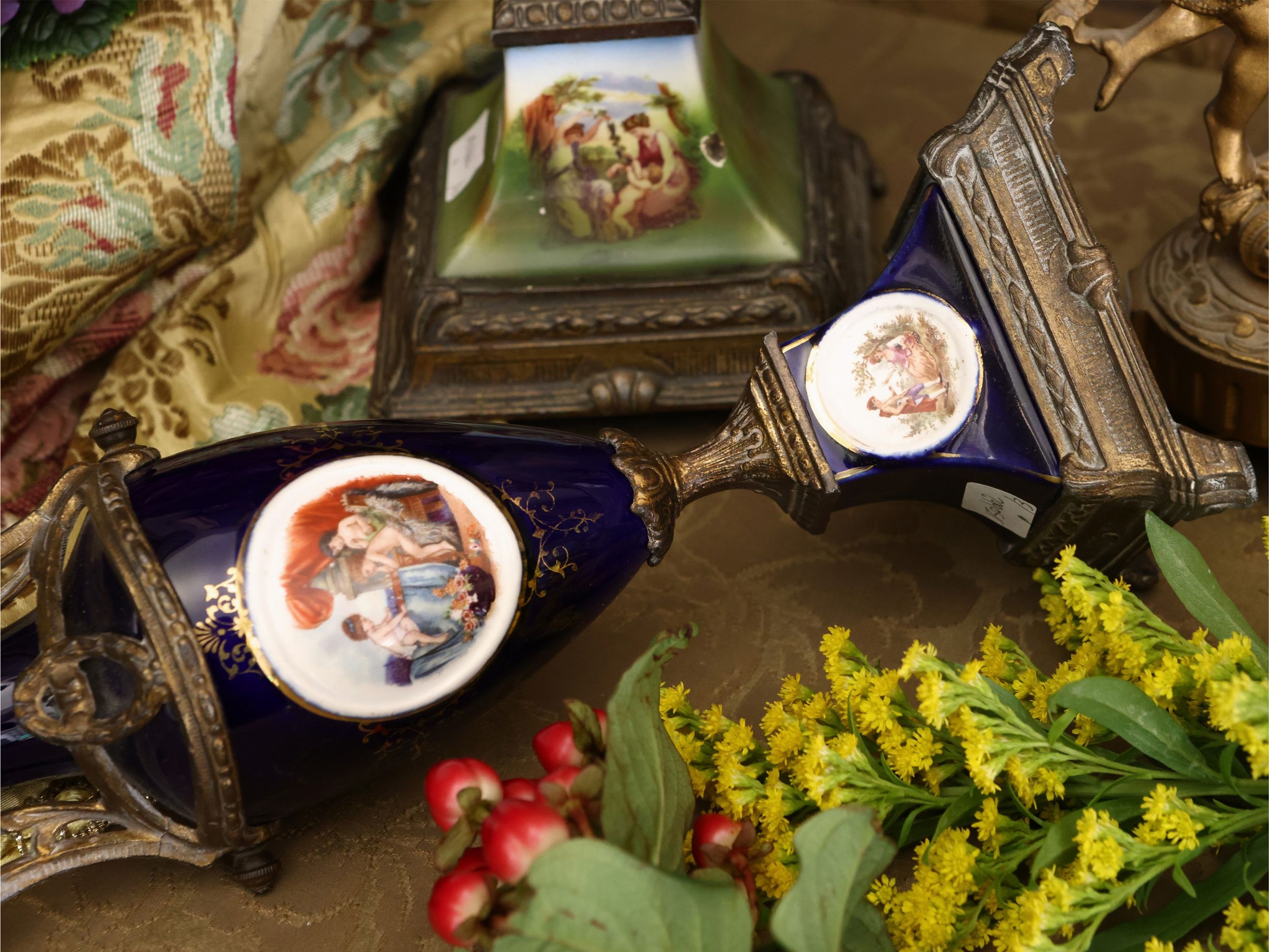 fine del XIX/inizio del XX secolo composto da due vasi in porcellana, decorati con motivi classici e rilegati in metallo ed un orologio da tavolo in metallo dorato con inserti in porcellana dipinta