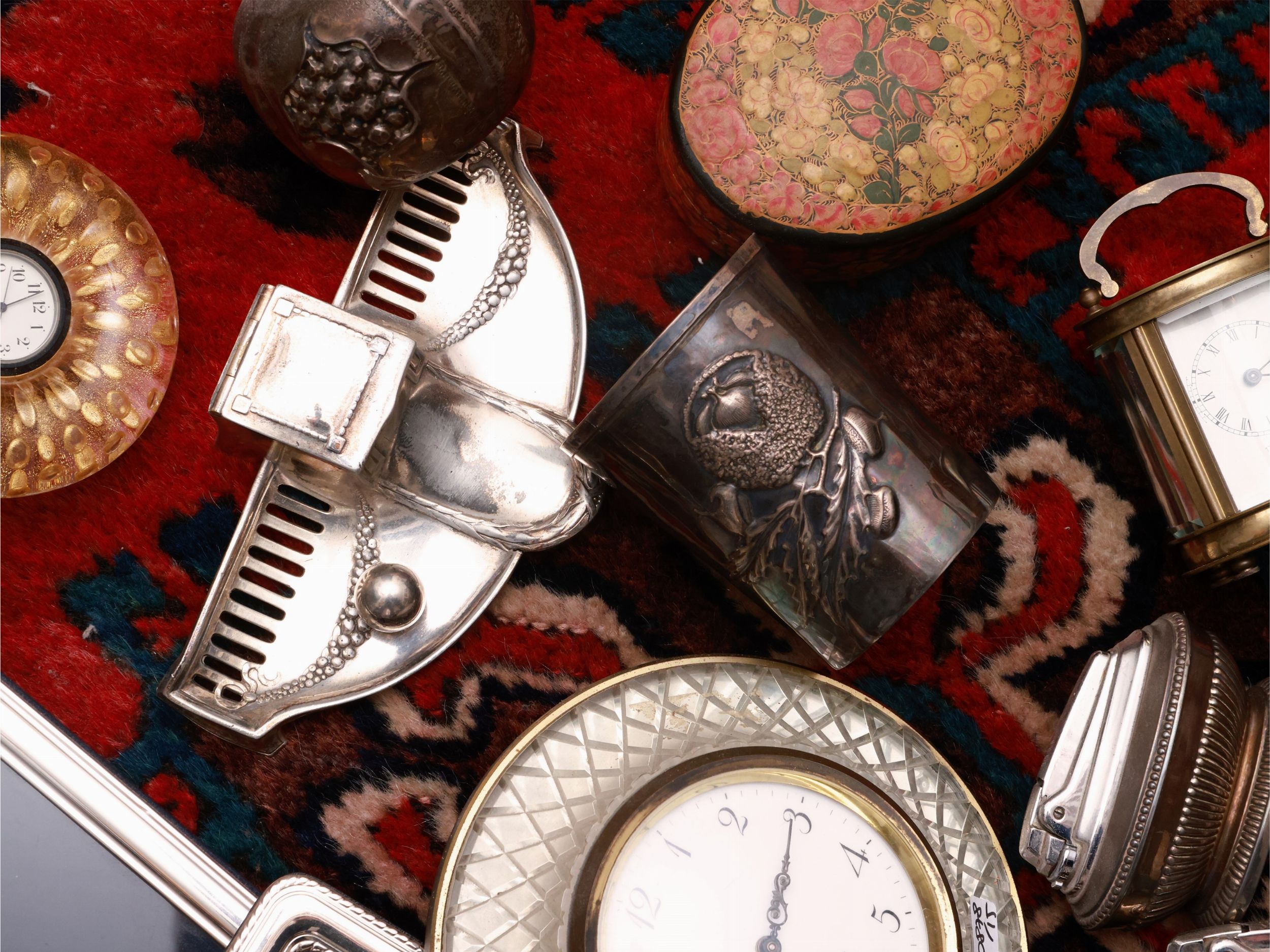 XIX/XX secolo tra cui tre cornici portaritratti in argento, un portapenne Brandimarte in argento, tre accendini in argento, una ufficialina d'epoca, un orologio da tasca ed altre curiosità, lievi difetti