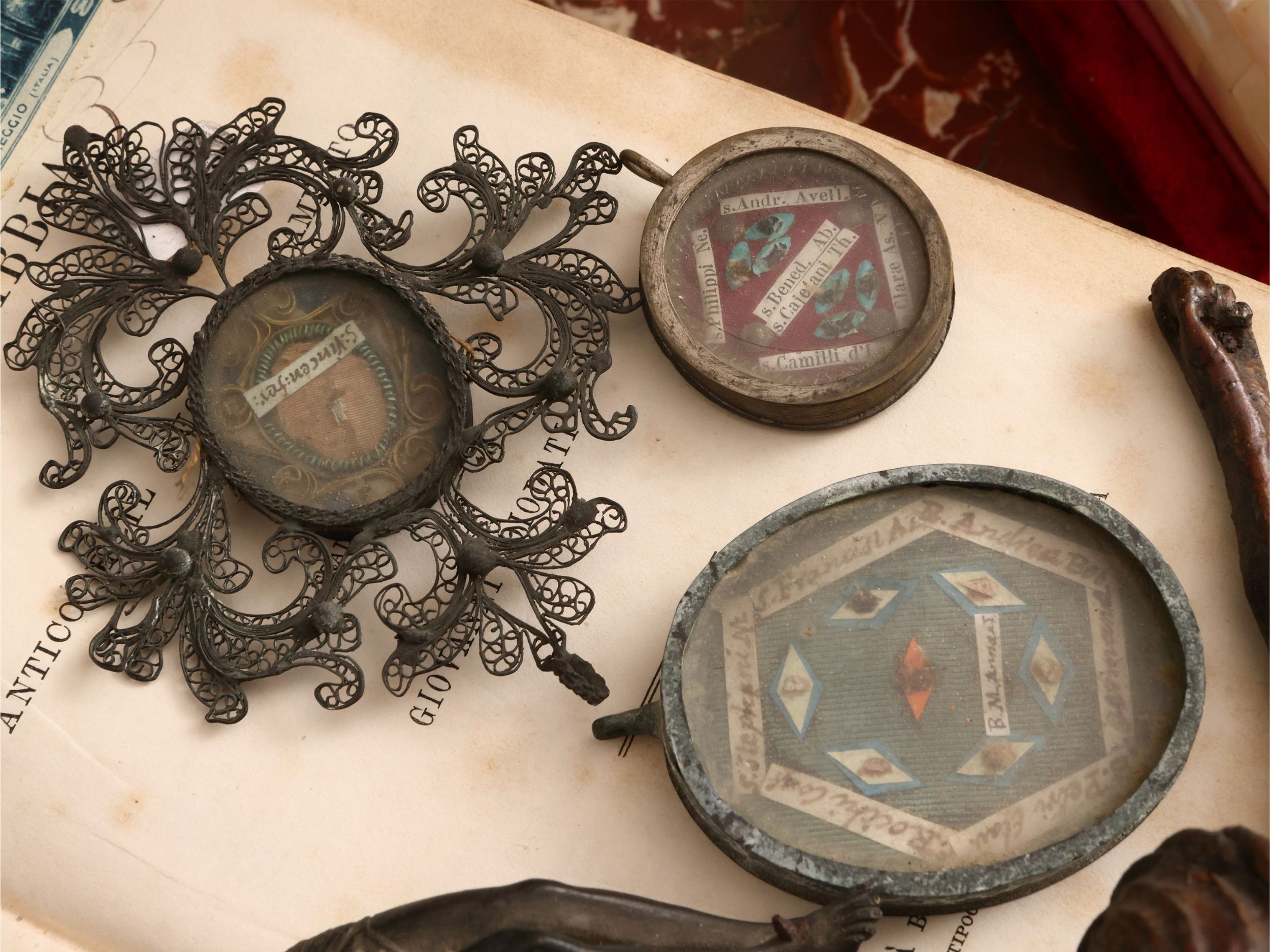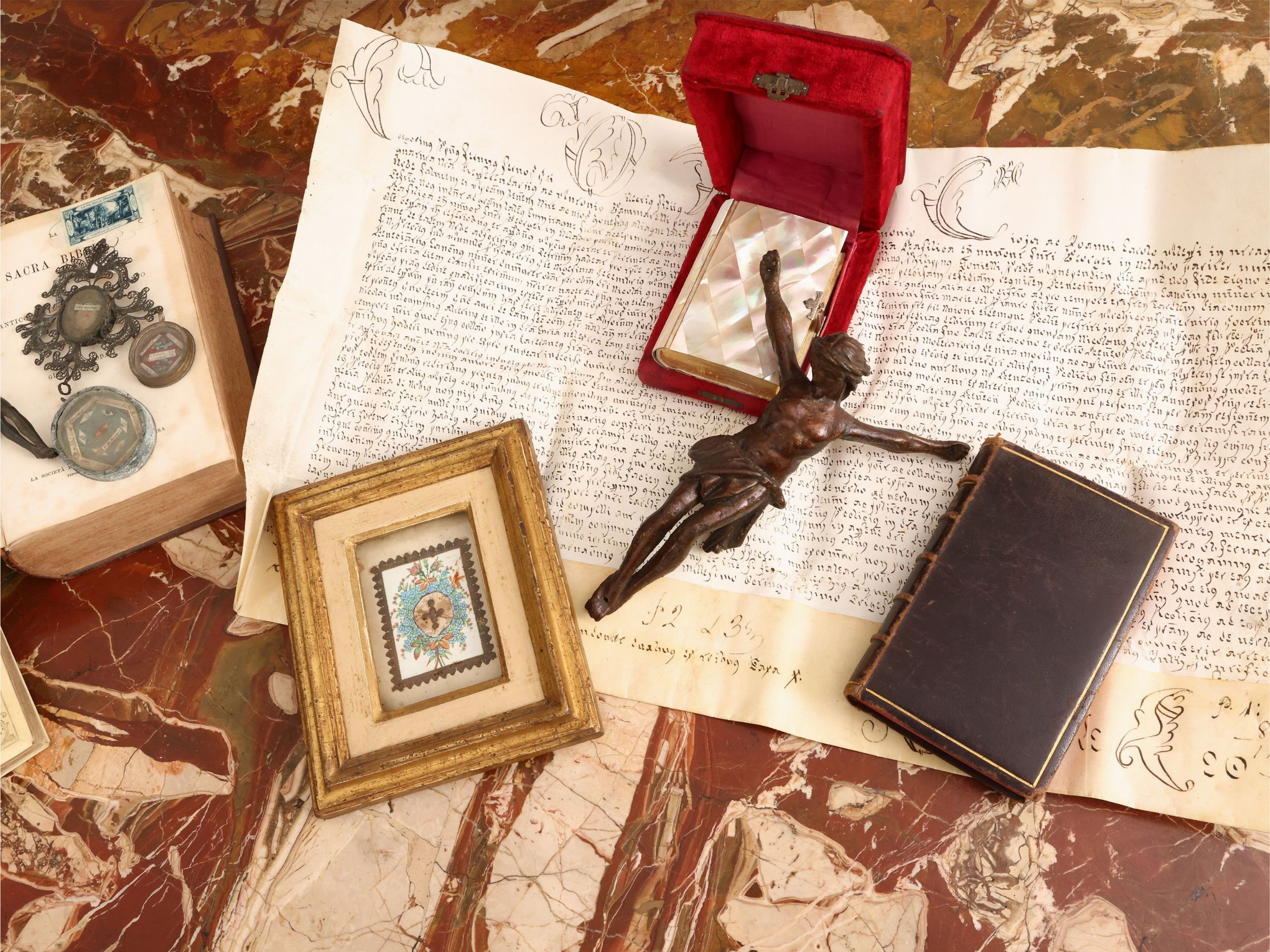 XVIII/XIX secolo tra cui due Cristi crocifissi, di cui uno in cartapesta, un antico documento manoscritto del 1532 ed alcune reliquie