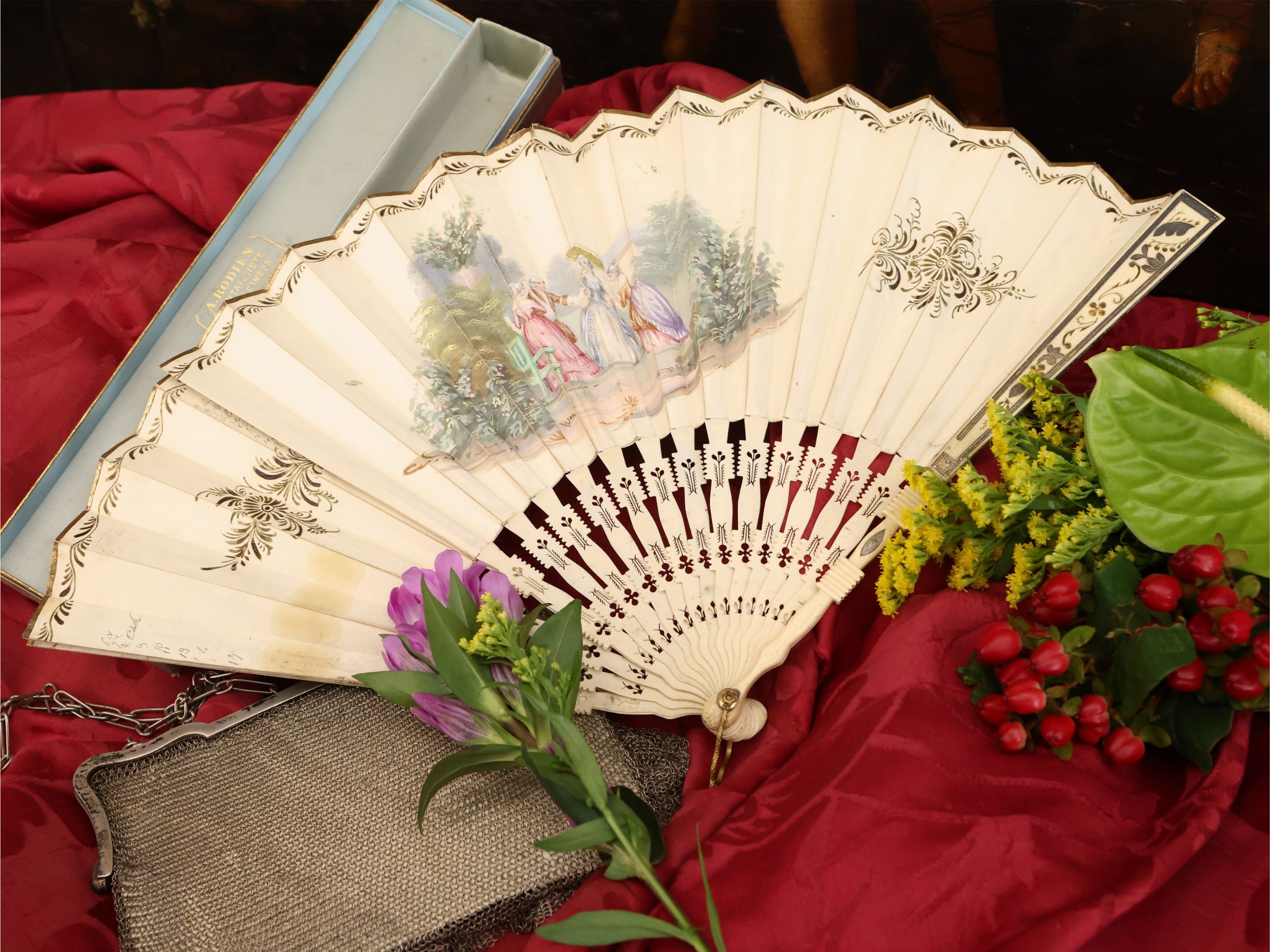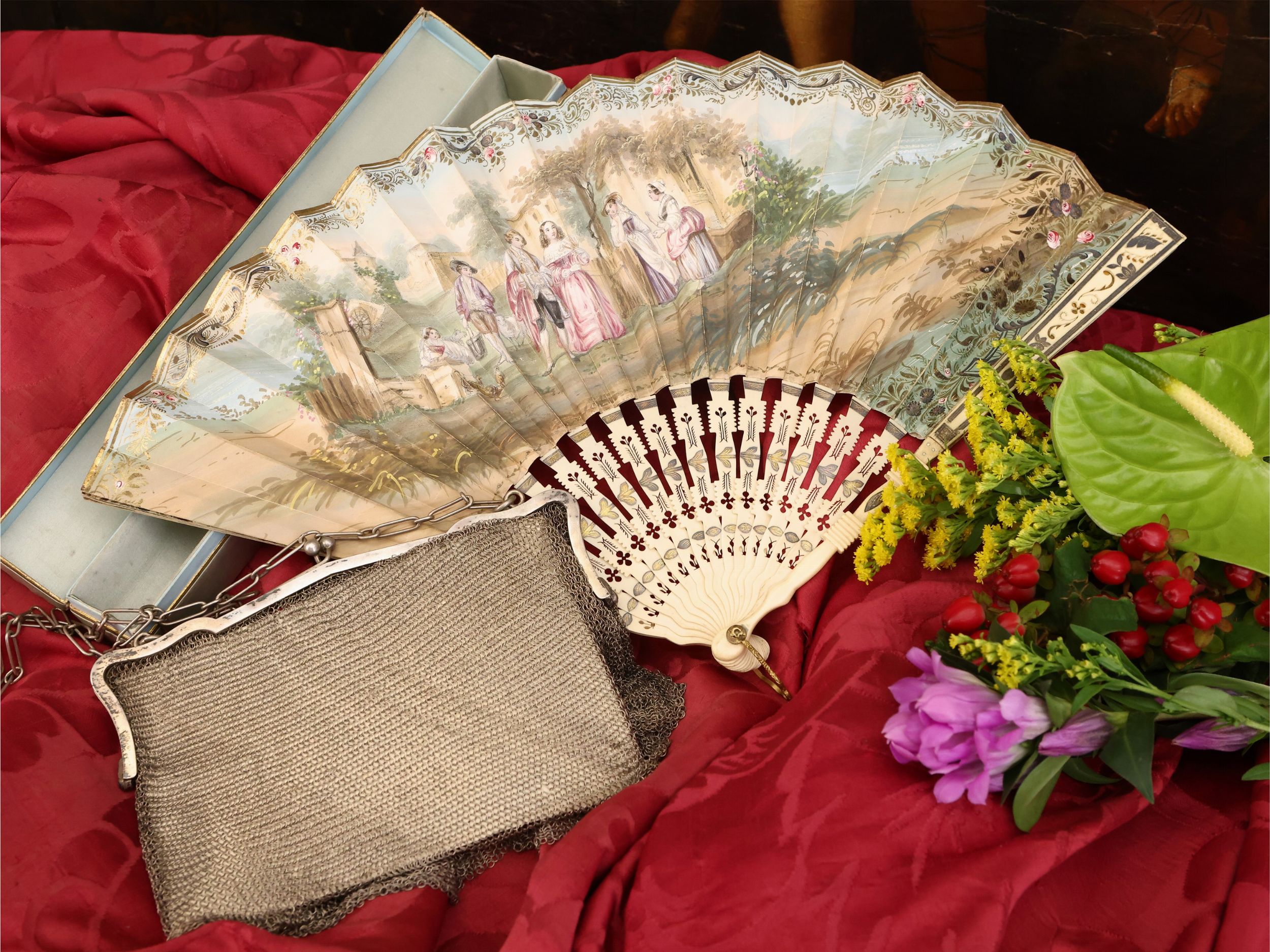 XIX/XX secolo composto da un ventaglio con stecche in avorio, pagina in carta dipinta con scena galante, entro scatola in raso celeste, lievi difetti e borsetta in maglia d'argento