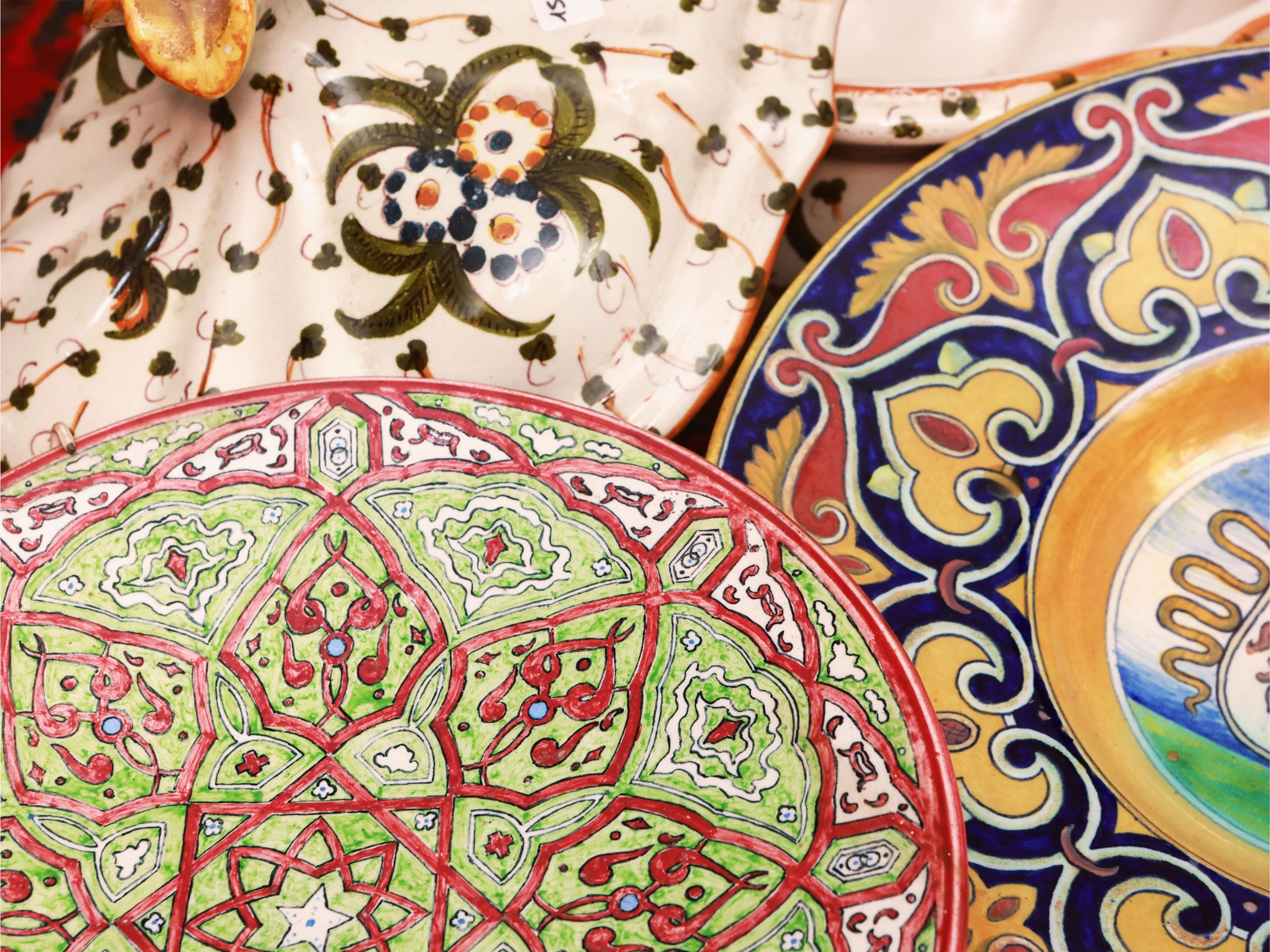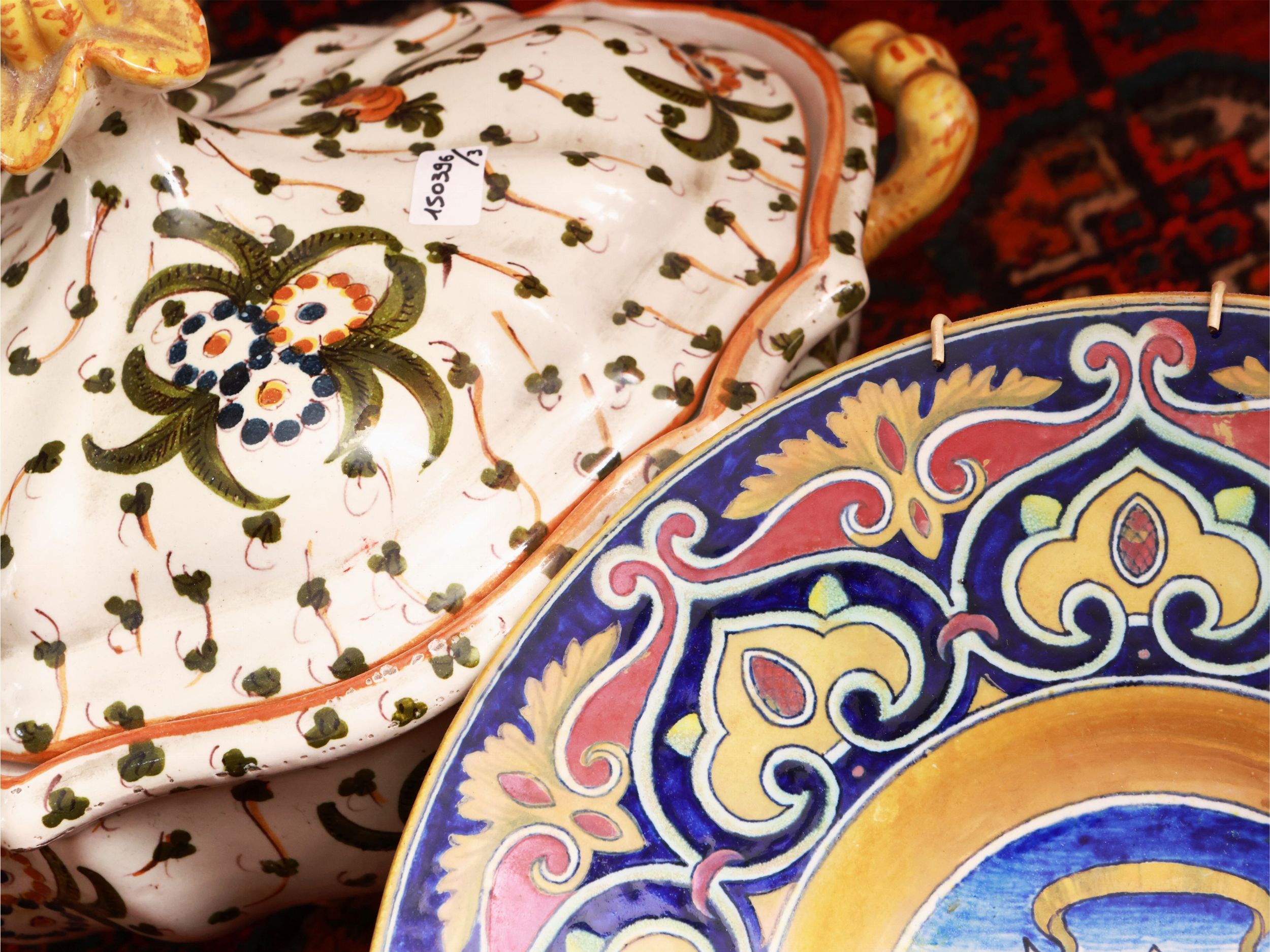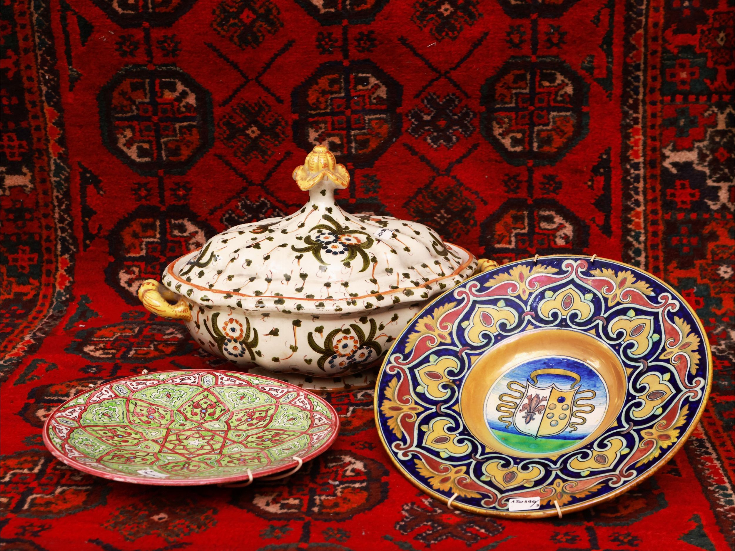 XIX/XX secolo composto da un piatto dipinto a lustro con stemma mediceo, una zuppiera dipinta con il fiore del tacchiolo (lievi difetti) ed un piatto all'orientale di altra manifattura