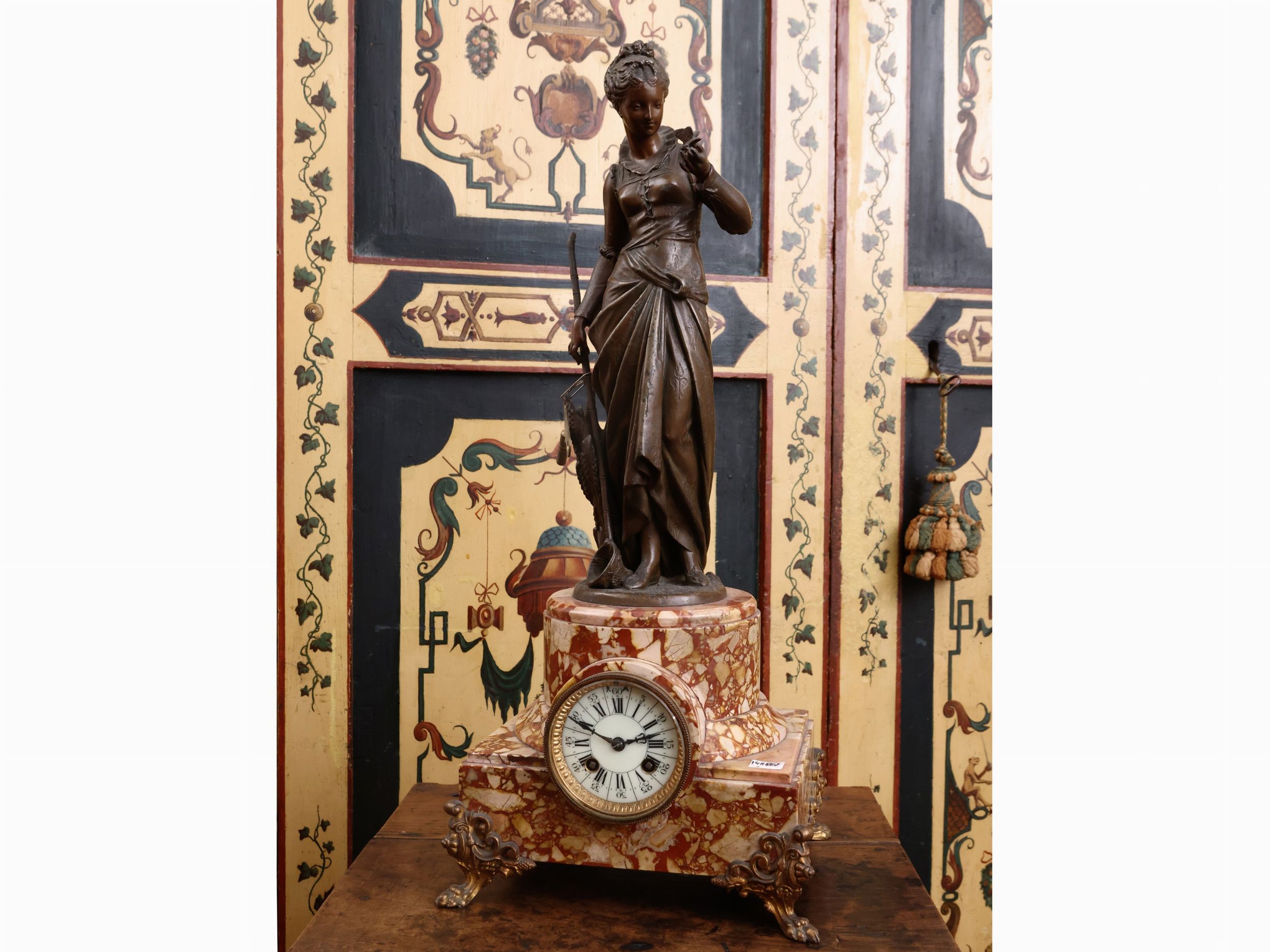 inizio del XX secolo sormontato da figura femminile allegorica con farfalla, quadrante in smalto con numeri romani ed arabi, alcuni difetti