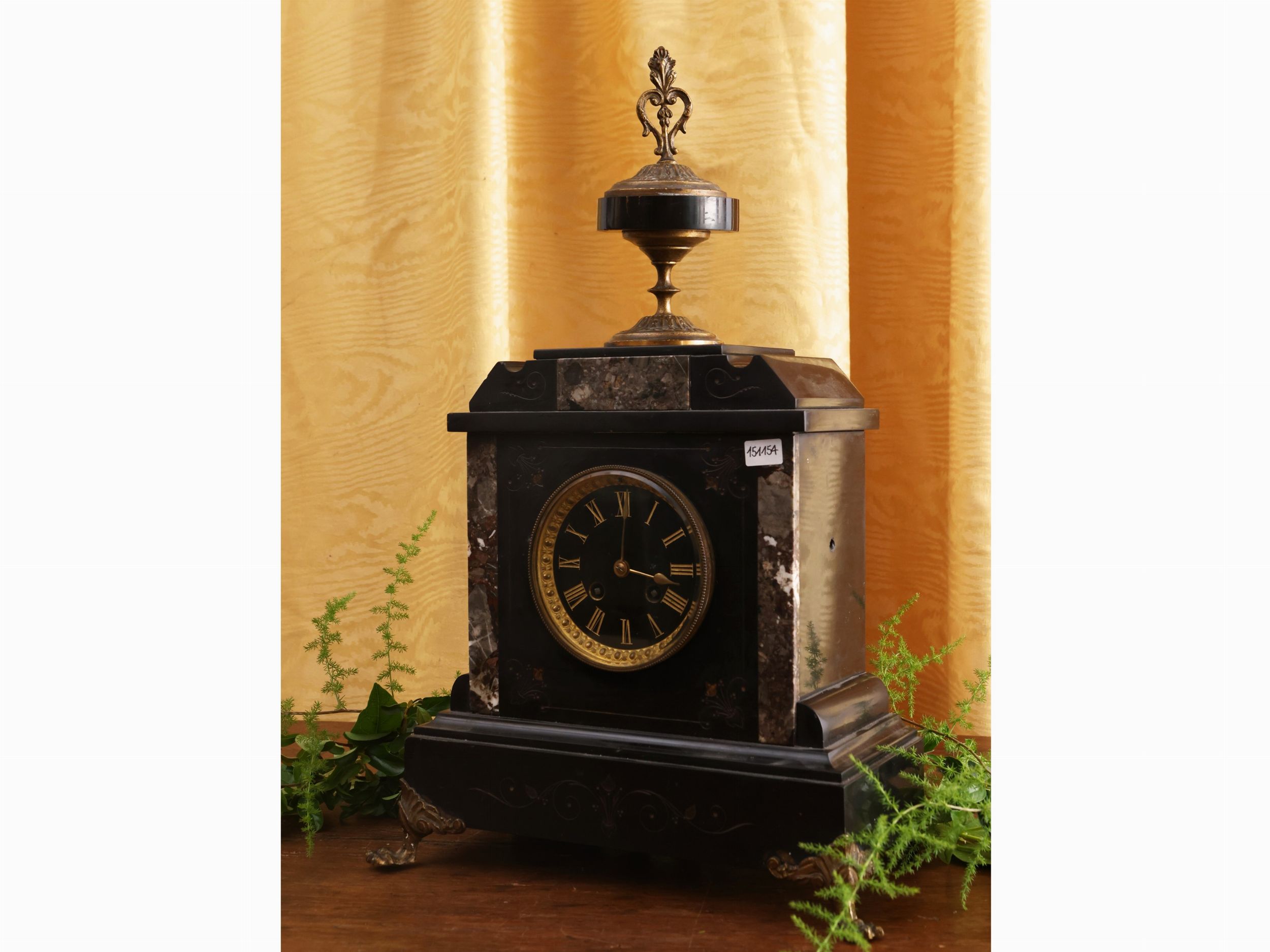 inizio del XX secolo sormontato da vaso a coppa, realizzato come un plinto con dettagli in marmo breccia e metallo, quadrante in marmo con numeri romani inciso e lumeggiati in oro, piedi ferini anteriori, lievi difetti