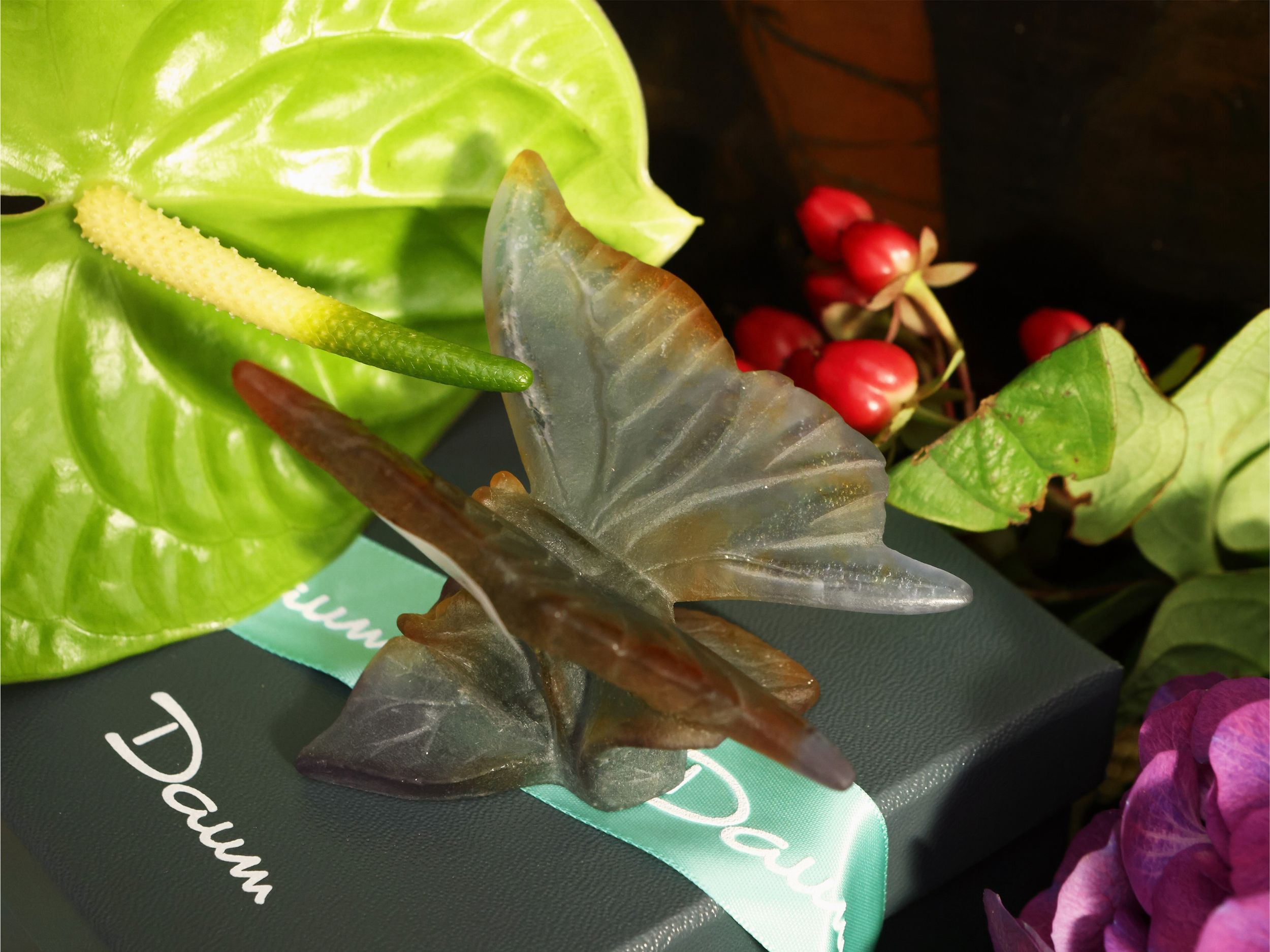Francia, XX secolo raffigurante una farfalla nei toni sfumati dal pervinca al ruggine, nella sua confezione regalo originale