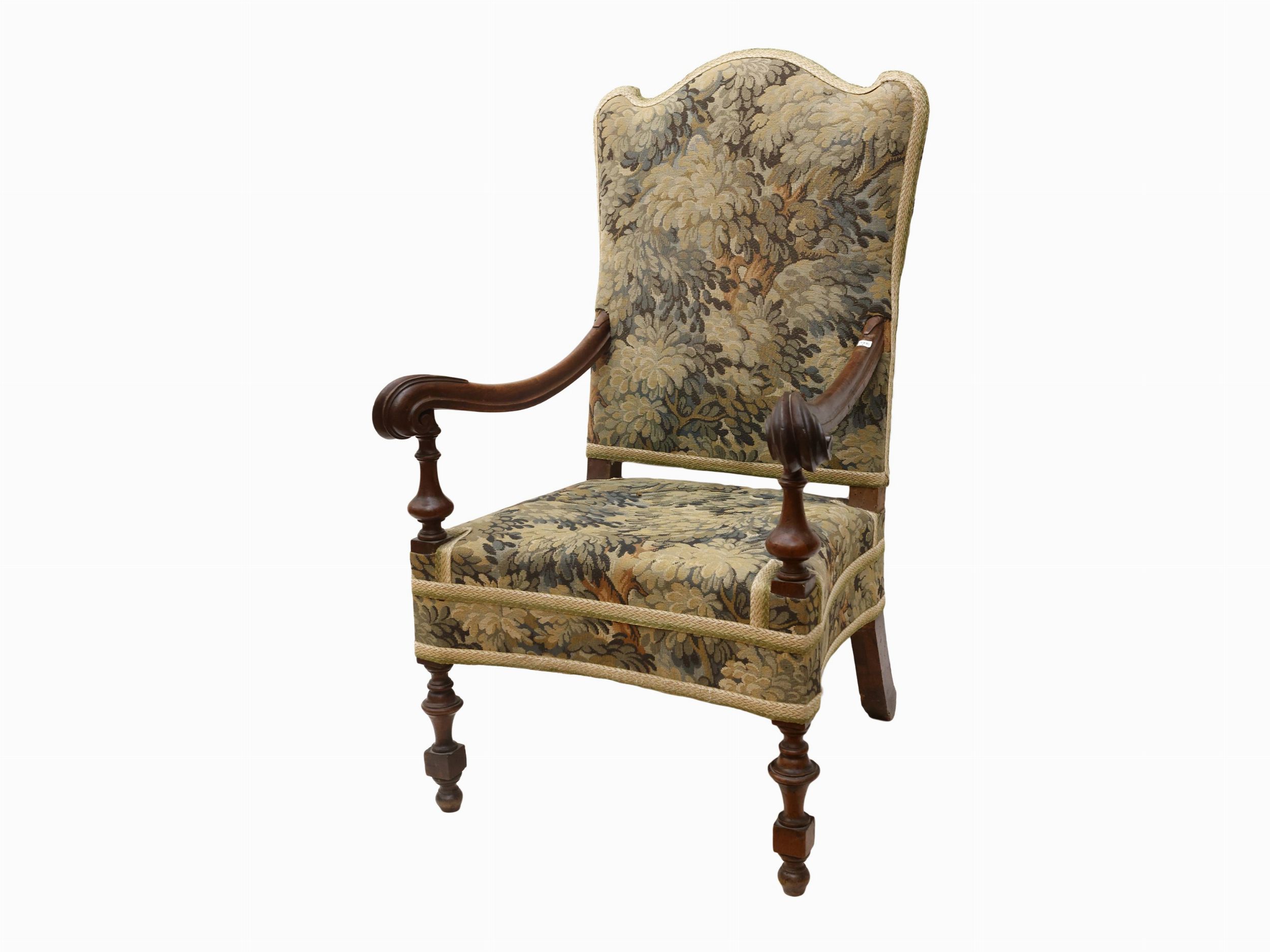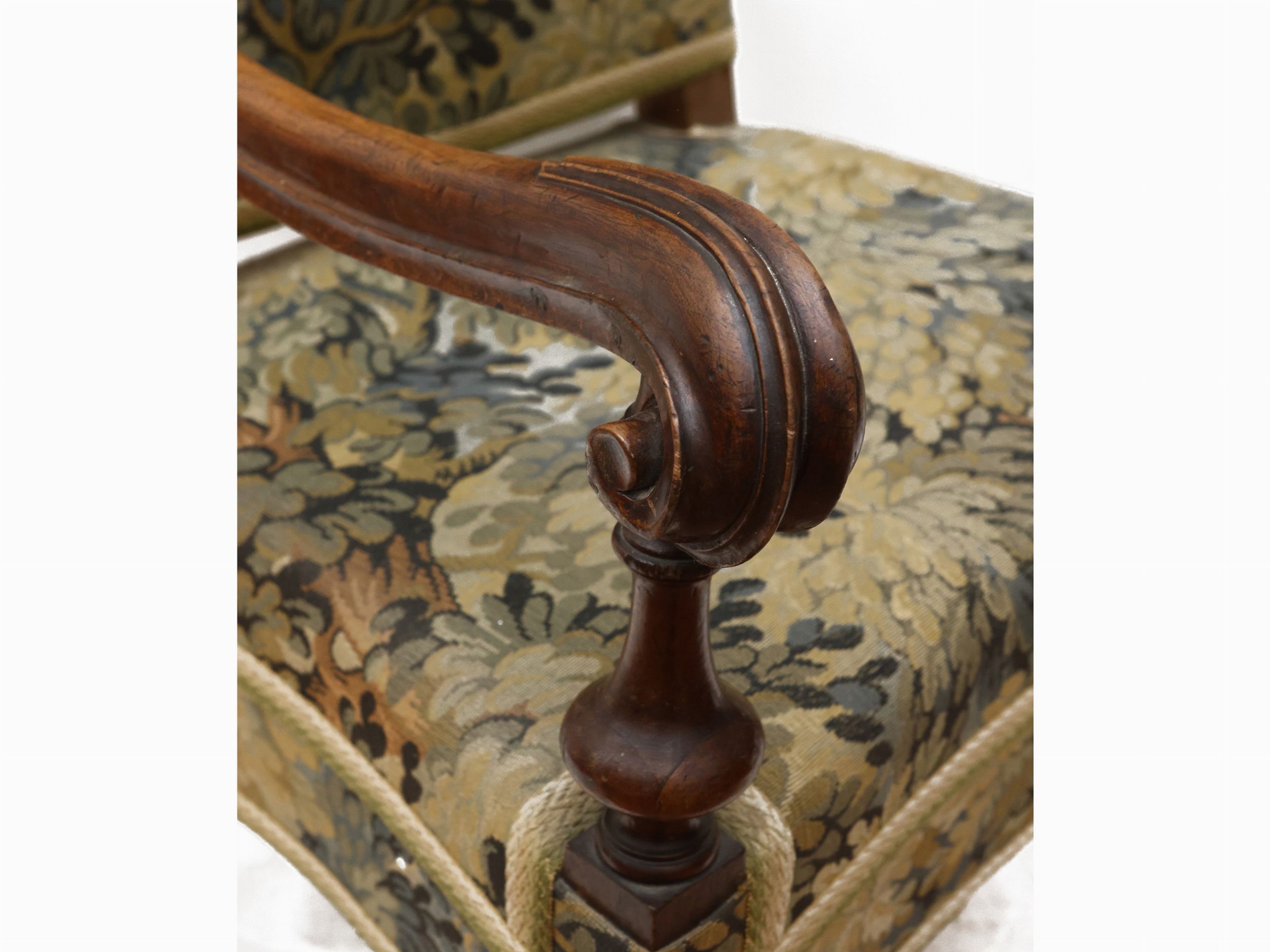 XVIII secolo braccioli a giorno desinenti a voluta su montanti a vaso, gambe anteriori tornite, le posteriori a sciabola, rivestito in tessuto gobelin a giardino nei toni del verde, alcuni difetti