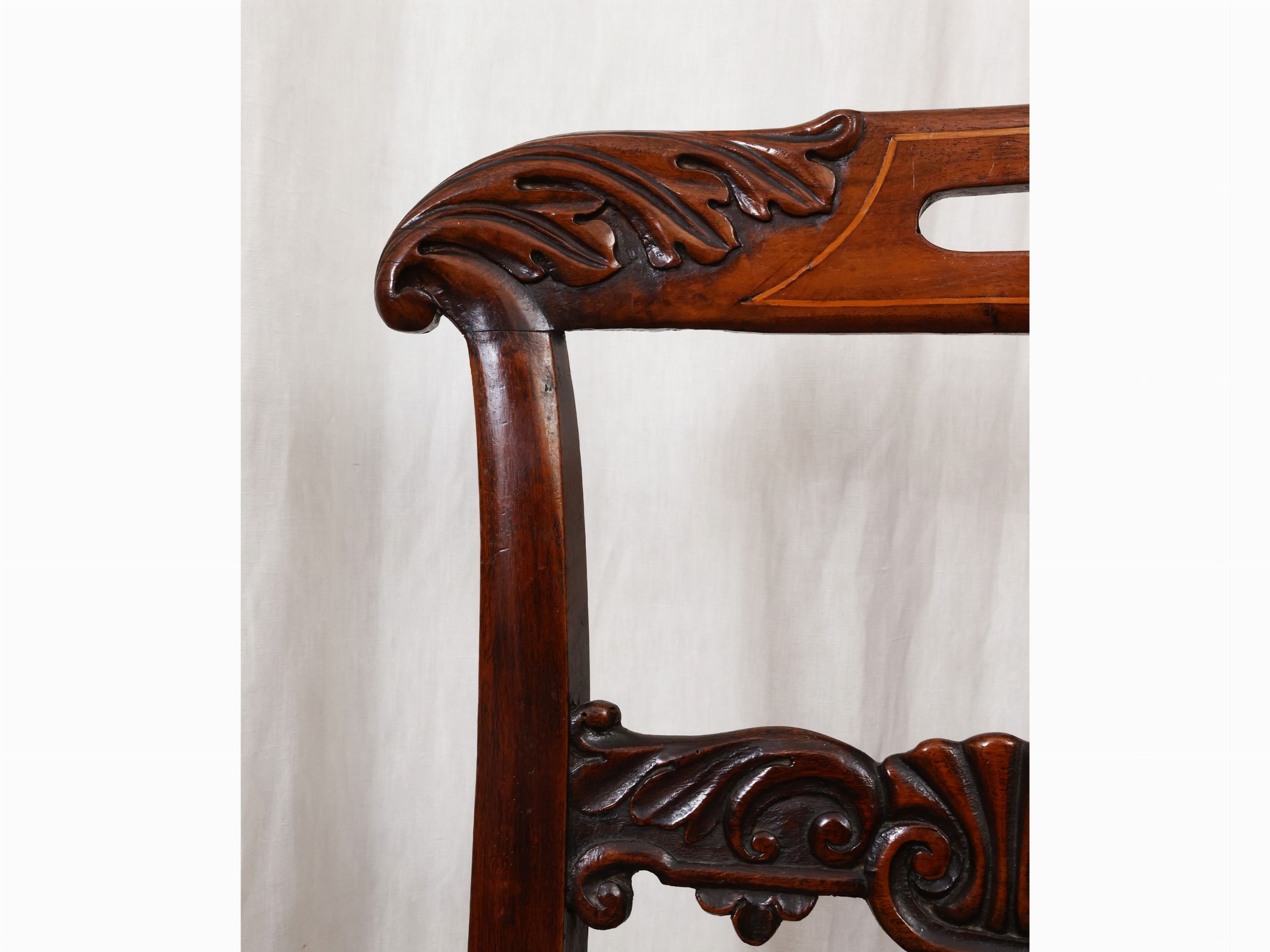 h cm 90 metà del XIX secolo intarsiate con sottile filettatura in legni di frutto, cartella centrata da conchiglia con presa a maniglia, sedili rivestiti in tessuto damier, gambe anteriori tornite a motivi globulari contrapposti, le posteriori a sciabola, lievi difetti