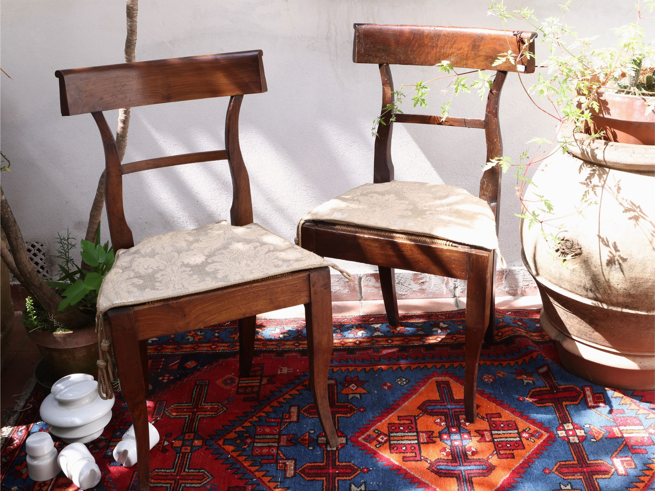 fine del XVIII secolo schienale con cartella lira stilizzata, due con sedile impagliato corredate da coprisedili in damasco color burro, gambe a sciabola, alcuni restauri e rifacimenti