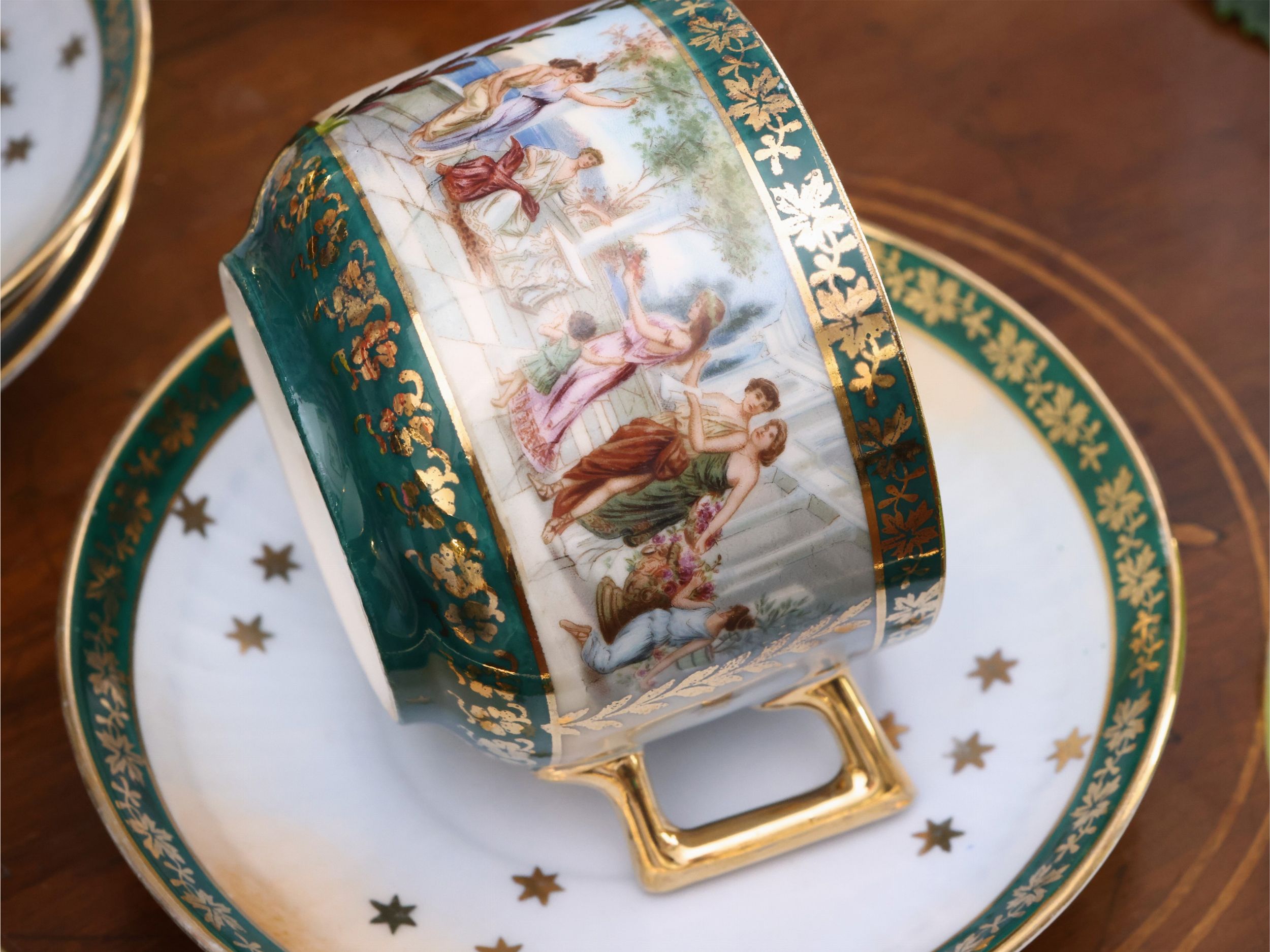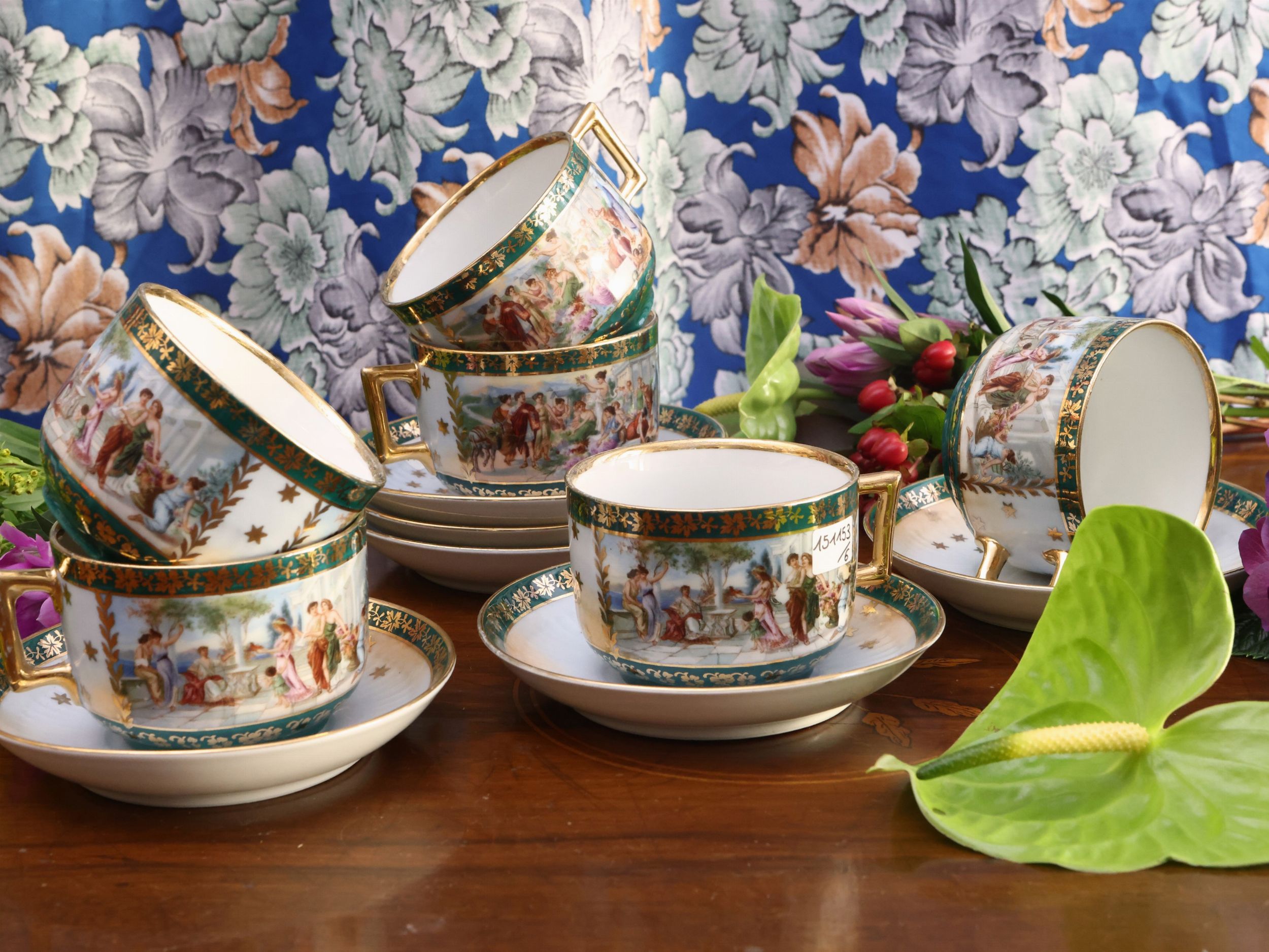 Ginori, inizio del XX secolo interamente dipinto con scene di genere nell'antica Roma, bordi verde smeraldo lumeggiati in oro con motivo a ghirlanda, composto da sei tazze con piattino, lievi difetti