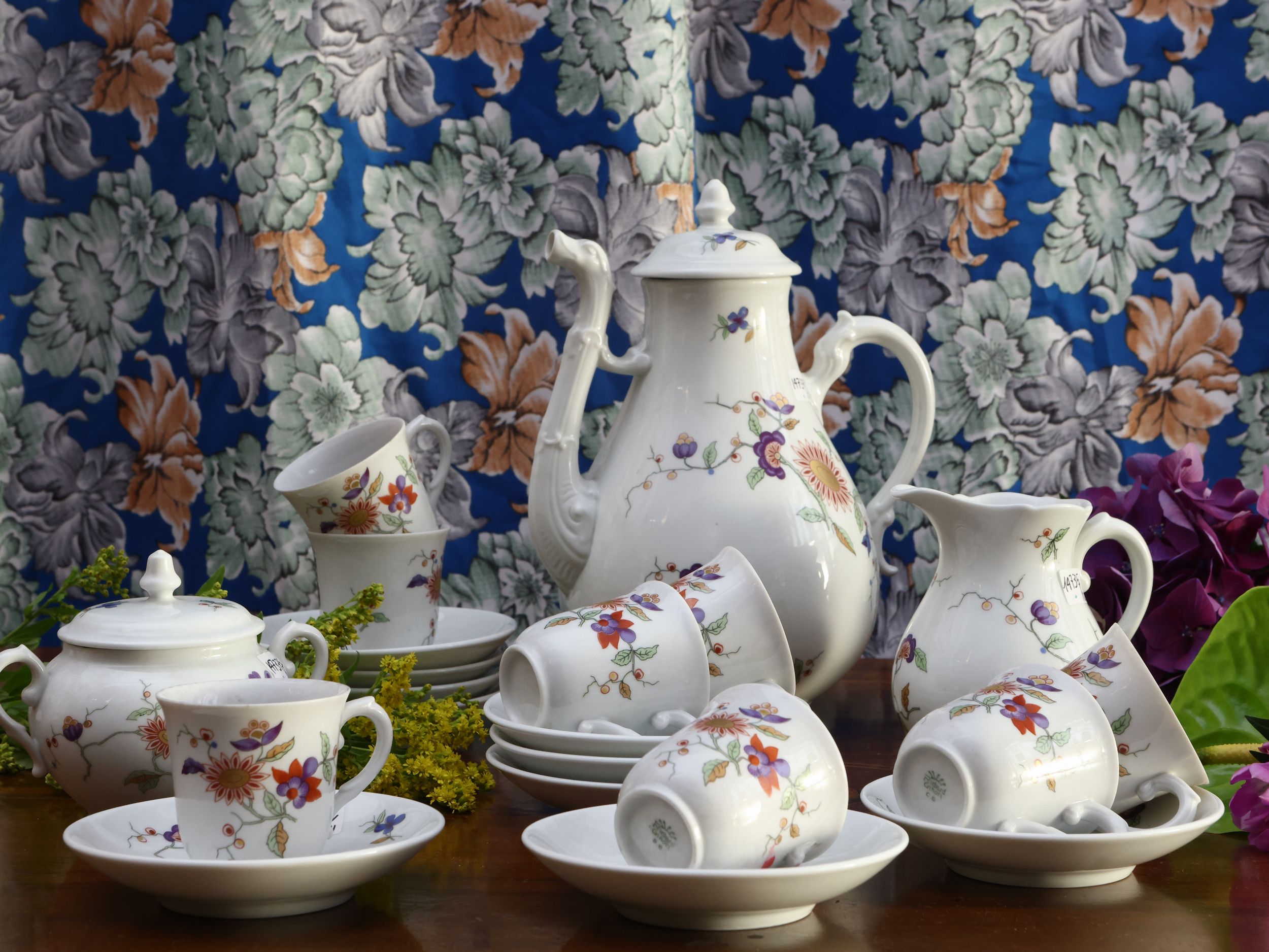 caffettiera h cm 24 (15) su modello settecentesco, dipinto con fiori nei toni del viola e lumeggiature dorate, composto da caffettiera con beccuccio zoomorfo, lattiera, zuccheriera e 8 tazzine corredate da 10 piattini, alcuni difetti e mancanze