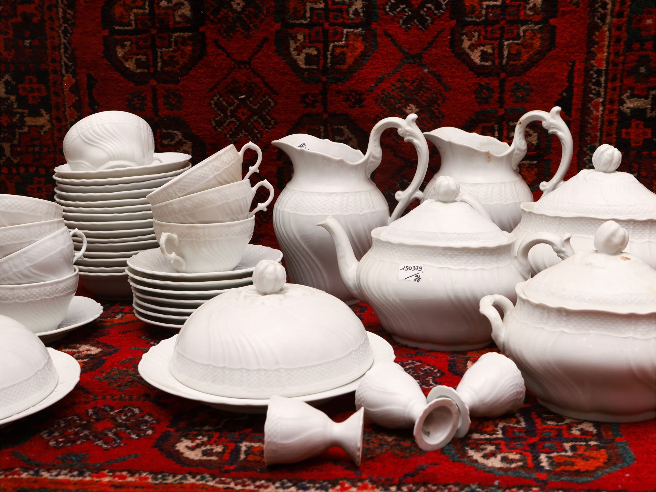 XX secolo composto da due teiere, due zuccheriere, due grandi bricchi da latte, 8 tazze da tè con piattino, 6 tazze da caffelatte, 9 piattini da dolce di due dimensioni, 14 coppette da frutta, due vassoi rotondi con cloche, 4 portauova grandi e tre piccoli, sale e pepe, possibili lievi difetti (54)