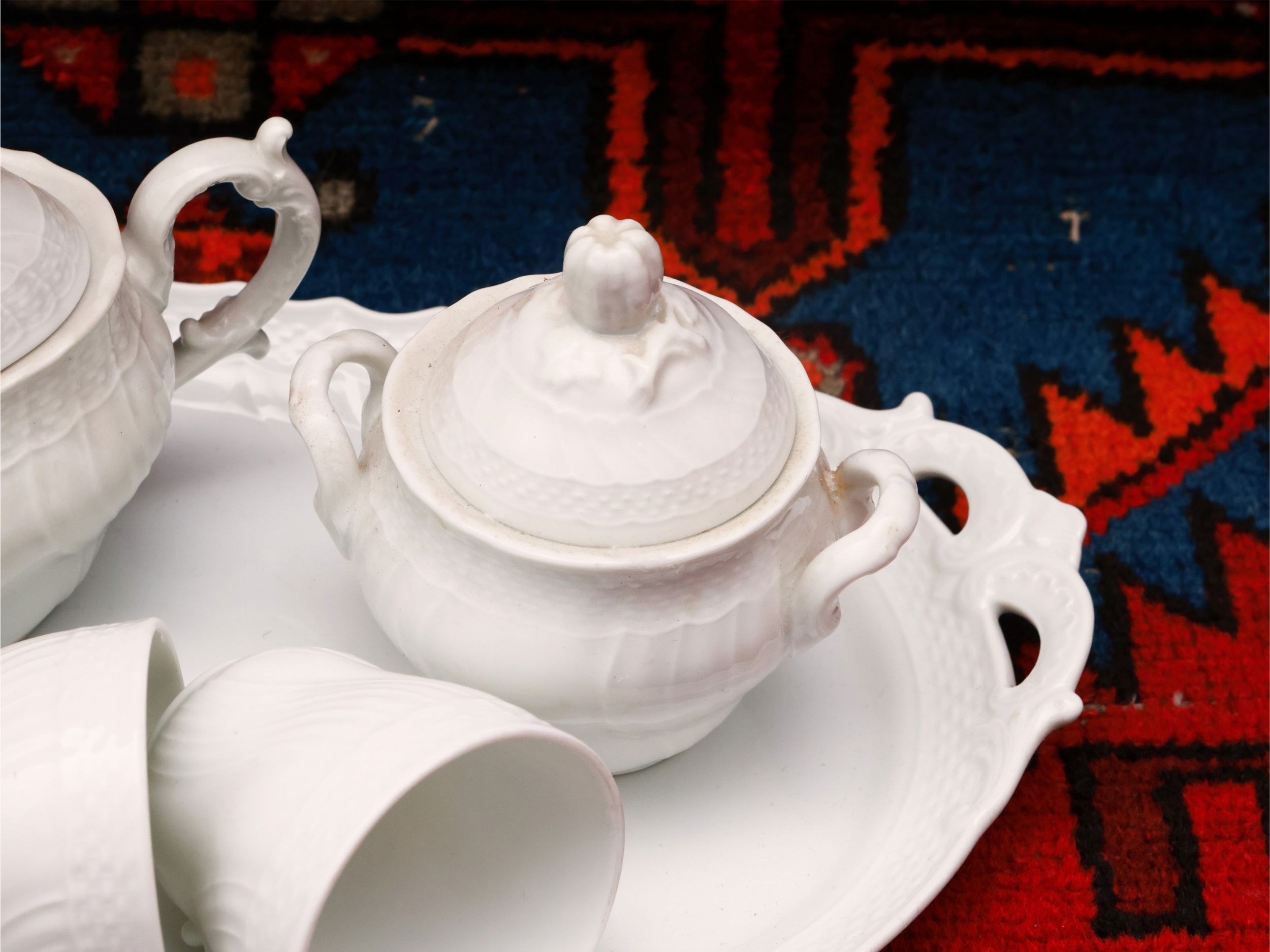XX secolo composto da caffettiera, lattiera, cremiera, zuccheriera, piccolo bricco, 16 tazzine da caffè con piattino, 12 tazze da tè con 6 piattini, 6 tazze da caffelatte, un vassoio ovale ed un'alzata per pasticcini, possibili lievi difetti (30)