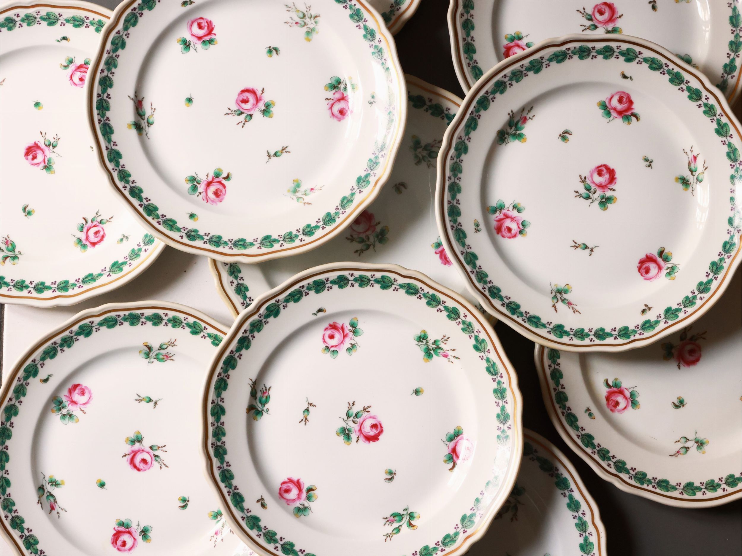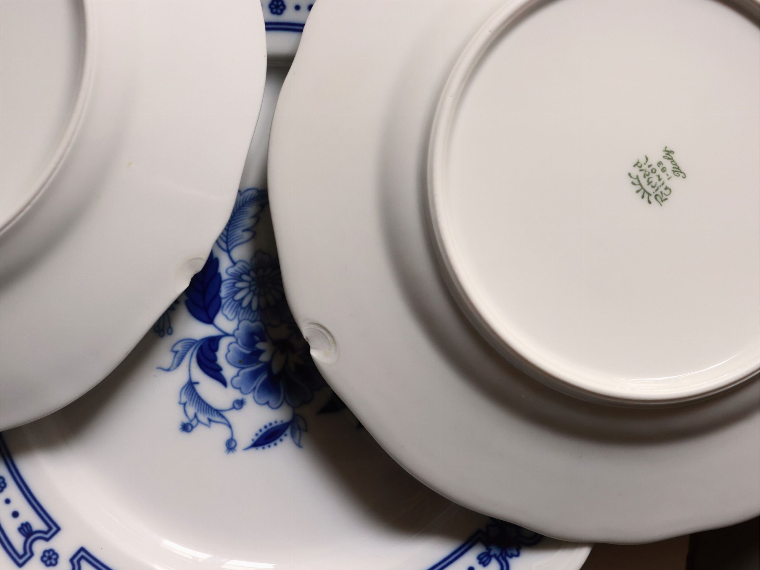 XX secolo decorato in monocromia blu con motivi floreali, composto da 12 piatti piani (due leggermente più piccoli), 14 fondi (tre leggermente più piccoli), 16 piattini, abbinato a 6 piatti piani e 6 fondi con decorazione policroma floreale di gusto orientale e ad una serie di 12 piattini dipinti con rose e ghirlande verdi, lievi difetti (66)