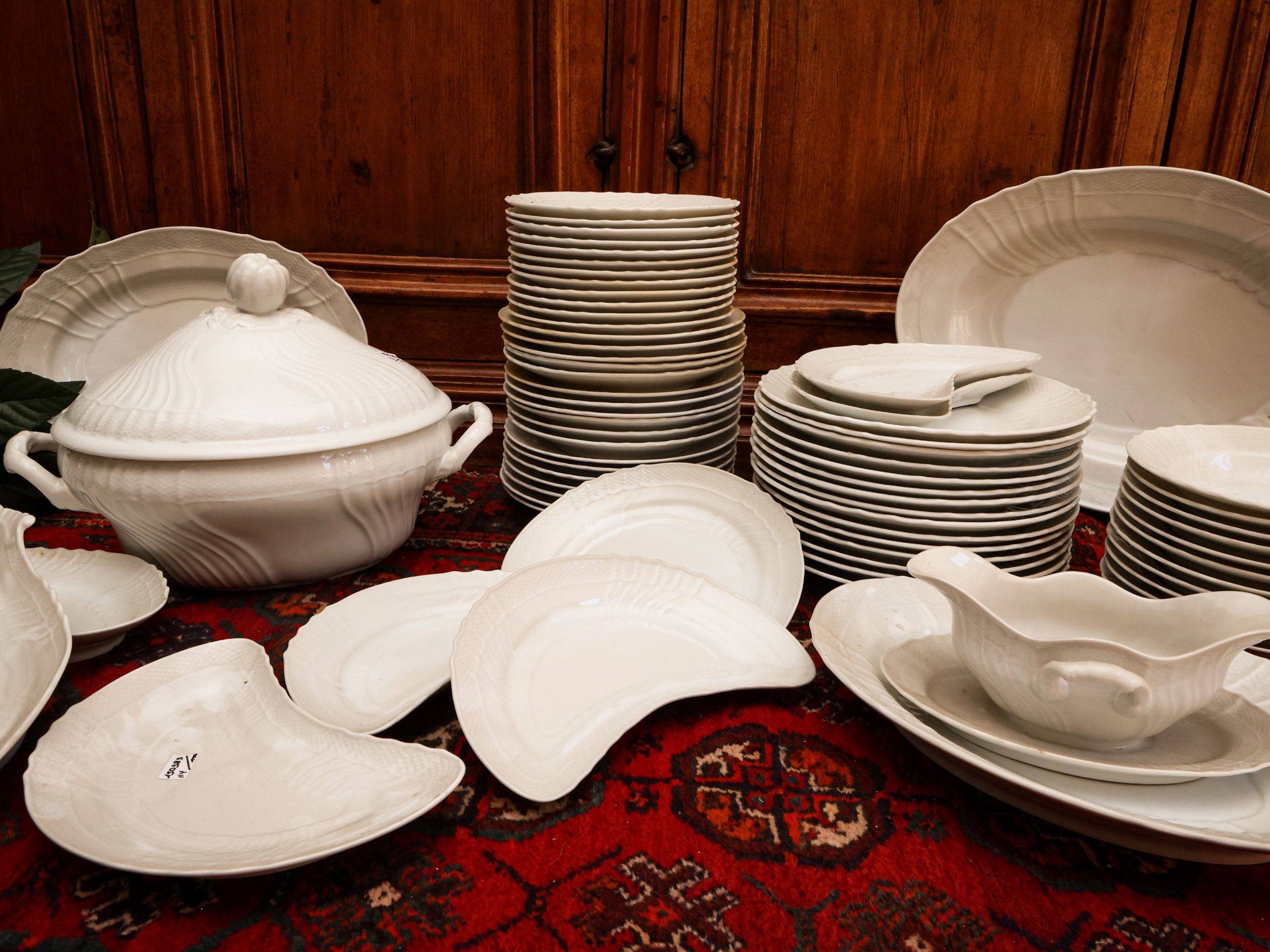 XX secolo completo per 12 persone, composto da 24 piatti piani di misure leggermente diverse, 16 fondi, 12 fondi più piccoli, 18 da frutta, 12 da antipasto, due zuppiere a scalare, 4 vassoi ovali di due misure, 6 lunette da insalata, due raviere, due legumiere, due insalatiere, salsiera, mostardiera, 12 tazze da consommé con piattini (uno mancante), possibili lievi difetti (114)