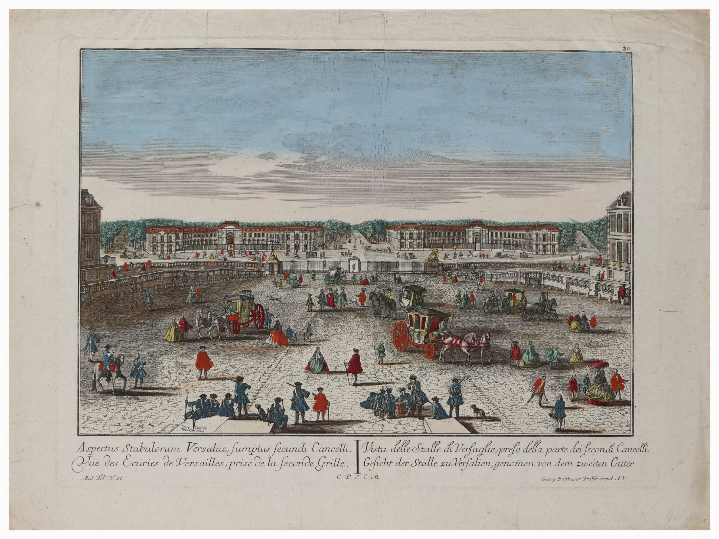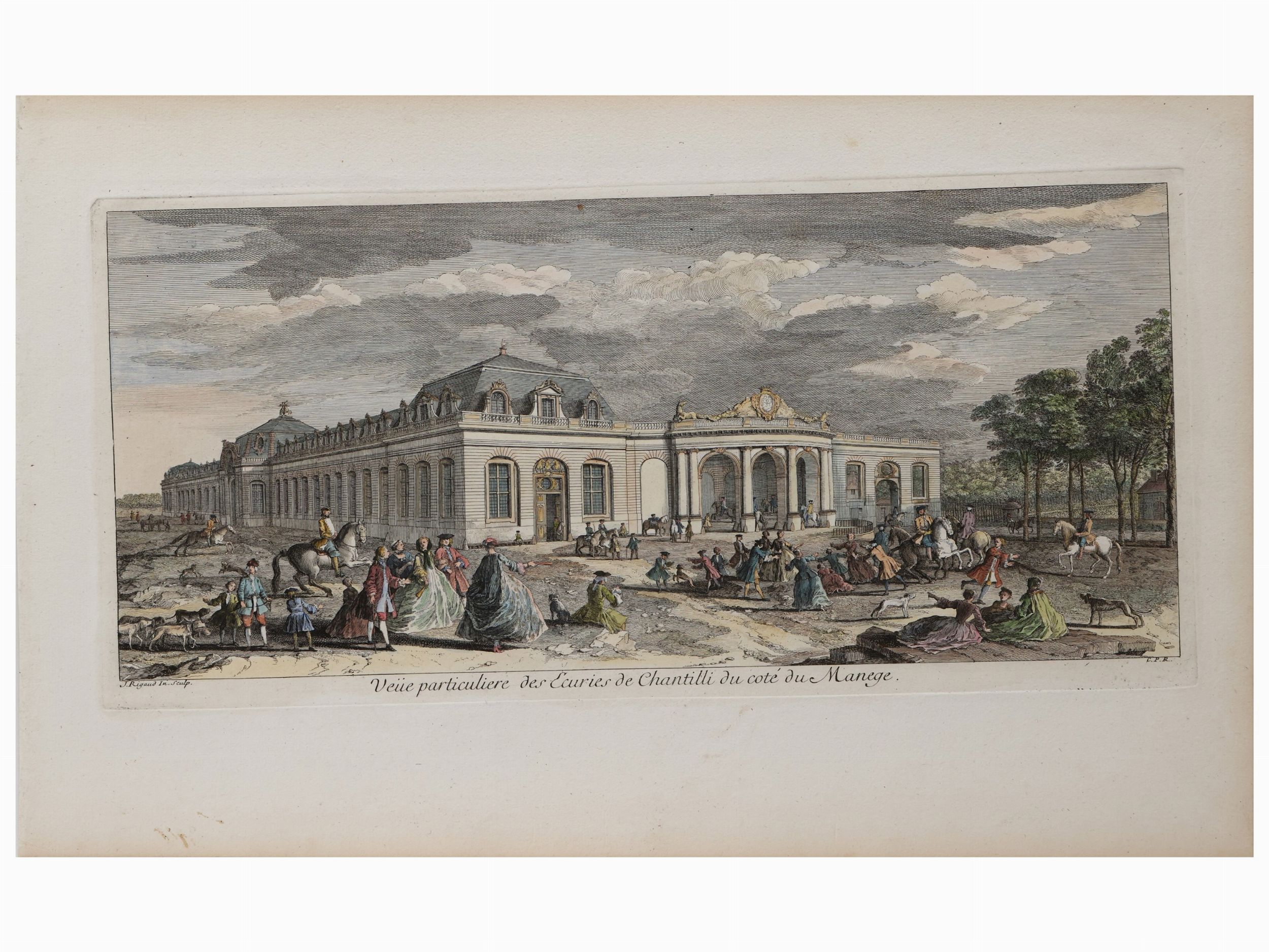 matrici cm 22.5x46, cm 24x46,5, cm 32x44 XVIII secolo Veue particuliere des Ecuries de Chantilli du coté du manege e Diverses Vues du Chateau de Chantili (J. Rigaud In. Sculp.), Aspectus Stabulorum Versailice, sumptus secundi Cancelli (Georg Balthasar Probst, excud. A.V.), tre incisioni su carta, lievi difetti