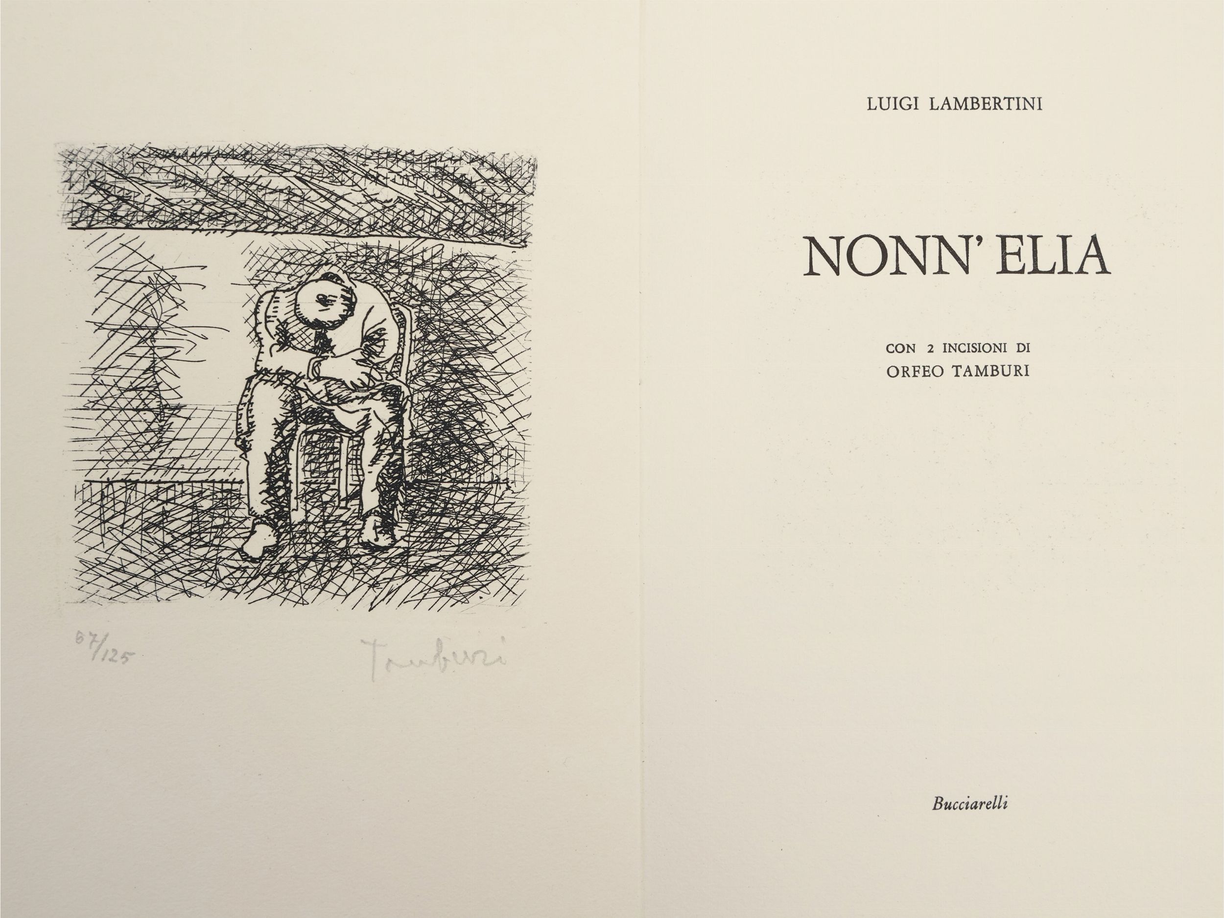 - Luigi Lambertini, Nonn’Elia, Bucciarelli, 1968, 42 p. (260x170 mm). Con due incisioni (110x110 mm) numerate e firmate, di Orfeo Tamburi. Es. n. 67/125 stampate con carattere Garaldus su carta a mano Fabriano “Umbria” gialla (5)