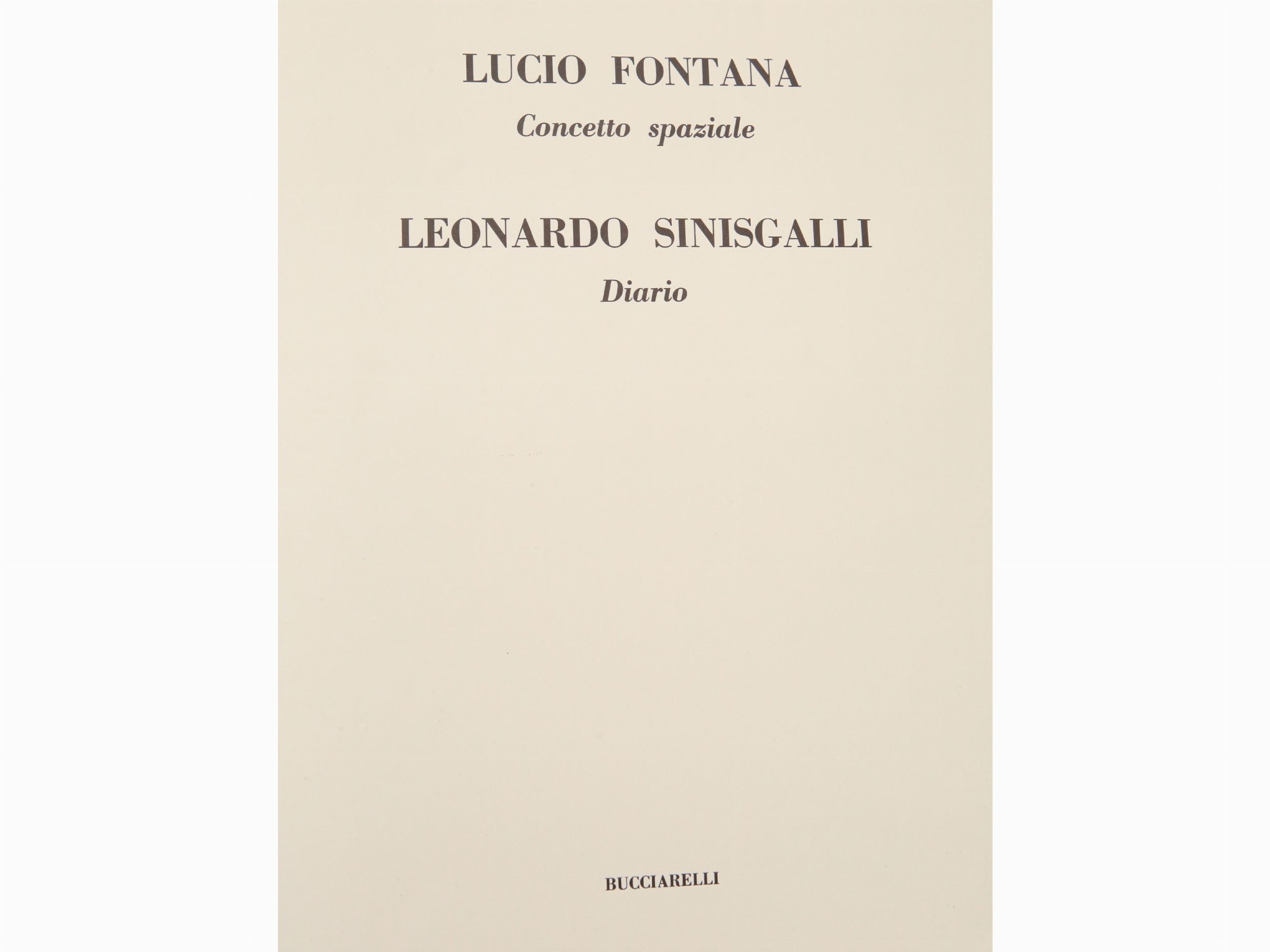 Bucciarelli, 1969 (50x35 cm). Pagina tipografica con una acquaforte originale (202x145 mm), numerata e firmata, di Lucio Fontana, stampata al torchio con fondino giallo e uno scritto di Leonardo Sinisgalli, Diario, con firma autografa. Questa acquaforte è l'ultima opera su carta di Fontana, eseguita poco prima di morire. L'editore Bucciarelli chiarisce al colophon: Questo omaggio alla memoria di Lucio Fontana esce nell'approssimarsi della prima ricorrenza della sua scomparsa in cinquanta copie numerate. La lastra da lui incisa e firmata nella primavera del 1968 doveva servire per una differente pubblicazione, ma lo scritto del Suo amico Leonardo Sinisgalli ha suggerito all'Editore di ricordare in questa maniera l'Artista e l'Amico (Roma 28 maggio 1969). Es. n. 3/50 su carta uso mano della cartiera di Fabriano