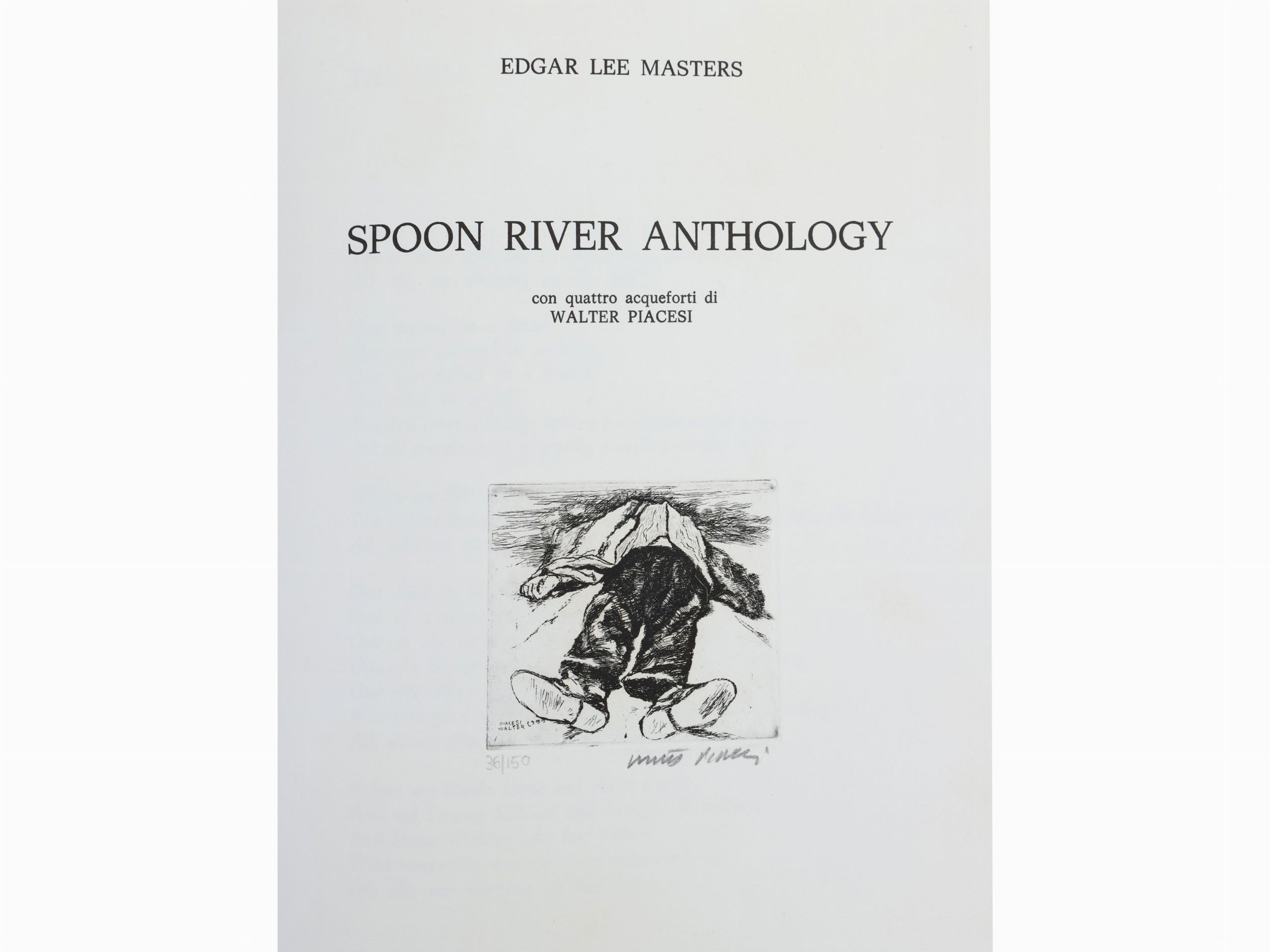 - Edgard Lee Masters, Spoon River anthology, Bucciarelli, 1977, 27 p. (360x26 mm). Con 4 acqueforti originali (150x210, 150x250, 190x270, 80x70 mm) numerate e firmate, di Walter Piacesi. Es. n.36/150 su carta a mano “Umbria”. Rilegatura in cartone pesante e tela marrone con impressioni in oro e sovracoperta in carta pergamenata. Lievi fioriture.