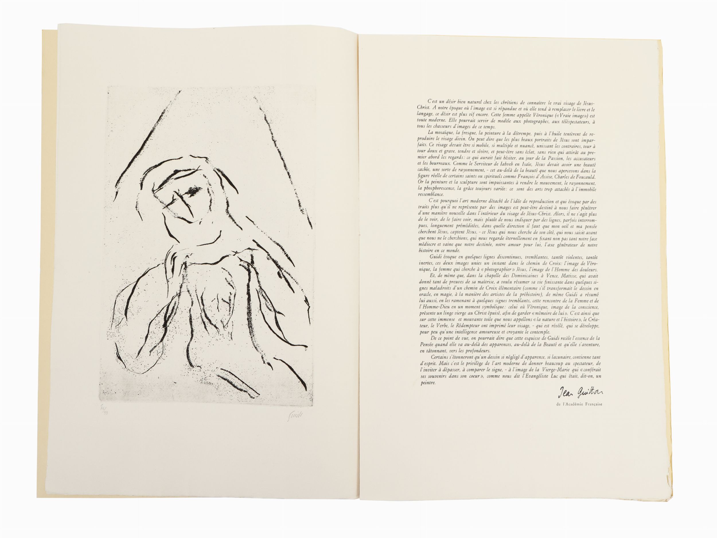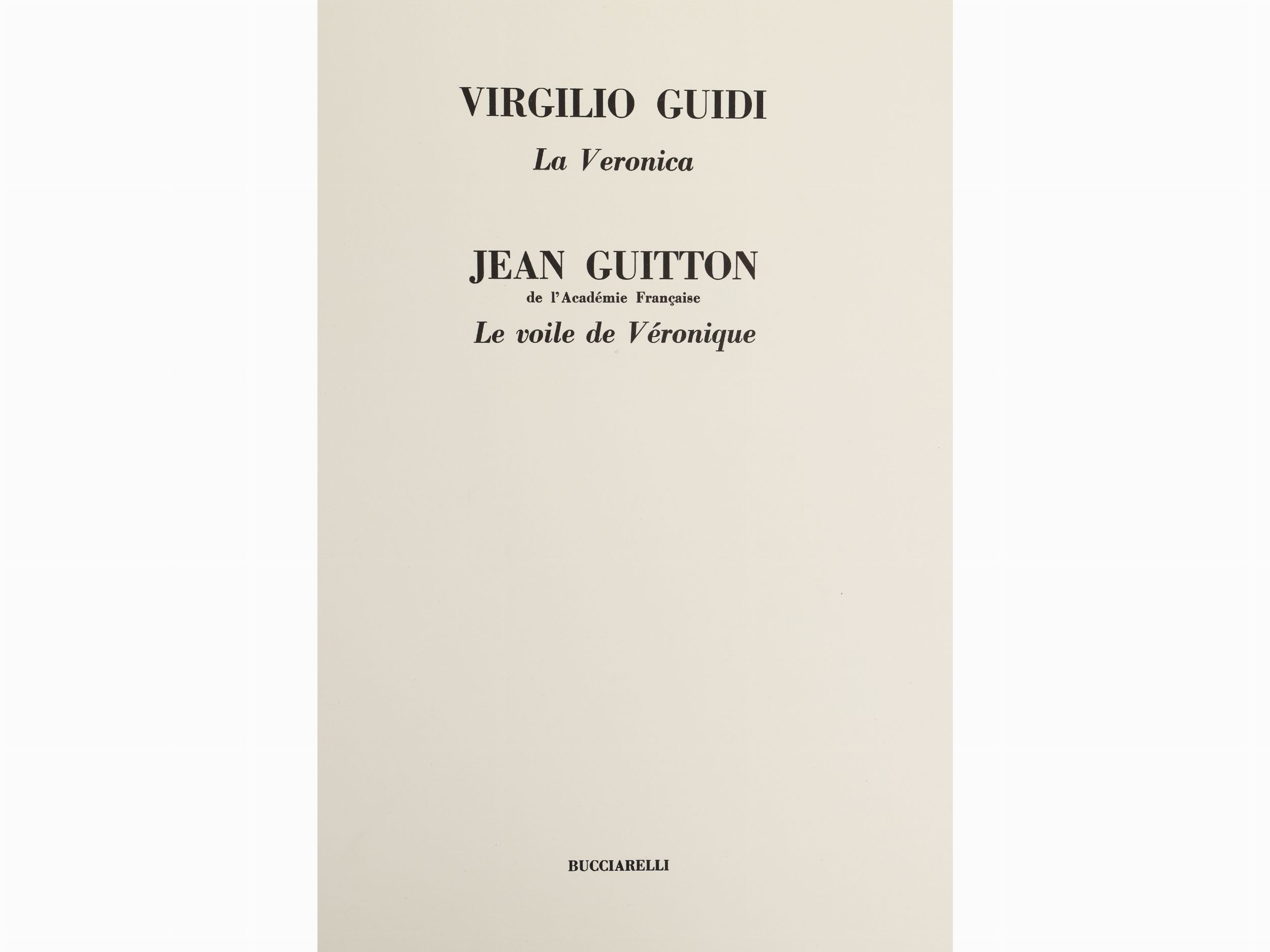 - Virgilio Guidi, La Veronica, Jean Guitton de l'Académie Française, Le voile de Véronique, Bucciarelli, 1969. (350x500 mm). Pagina tipografica con una acquaforte originale (340x240 mm) numerata e firmata, di Virgilio Guidi e un brano letterario, con firma autografa, di Jean Guitton. Es. n. 76/99 su carta a mano Fabriano gialla filigranata “Umbria”.