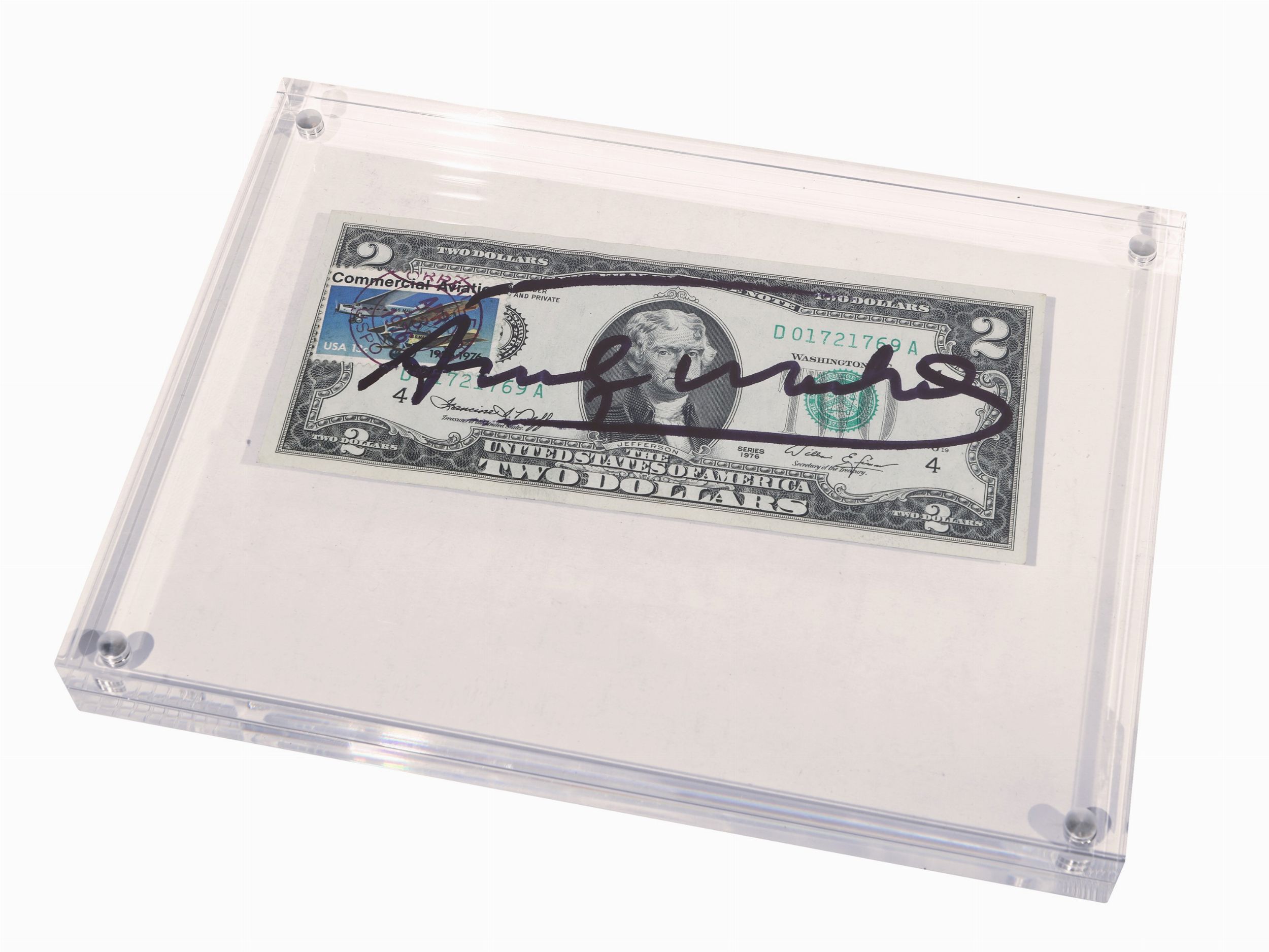 banconota firmata, entro cornice in plexiglass