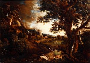 Scuola del XVIII secolo Paesaggio con ponte e figure