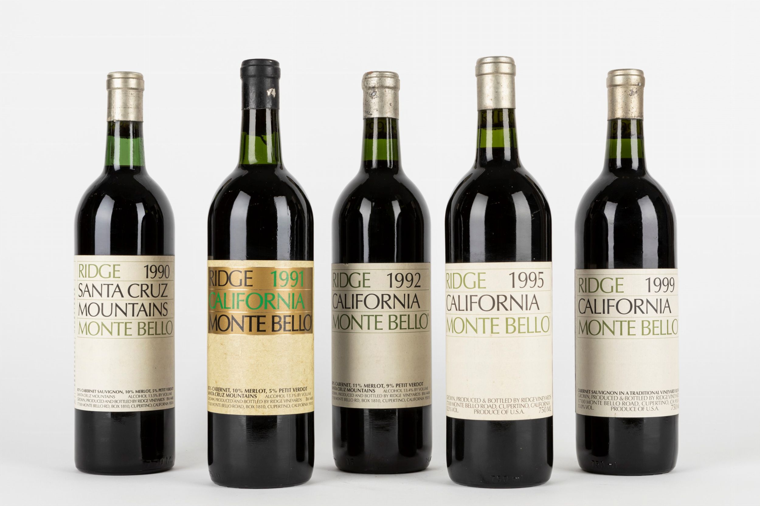 Ridge Santa Cruz Mountains Monte Bello 1990 (1 bt) Ridge California Monte Bello 1991 (1 bt) Ridge California Monte Bello 1992 (1 bt) Ridge California Monte Bello 1995 (1 bt) Ridge California Monte Bello 1999 (1 bt)