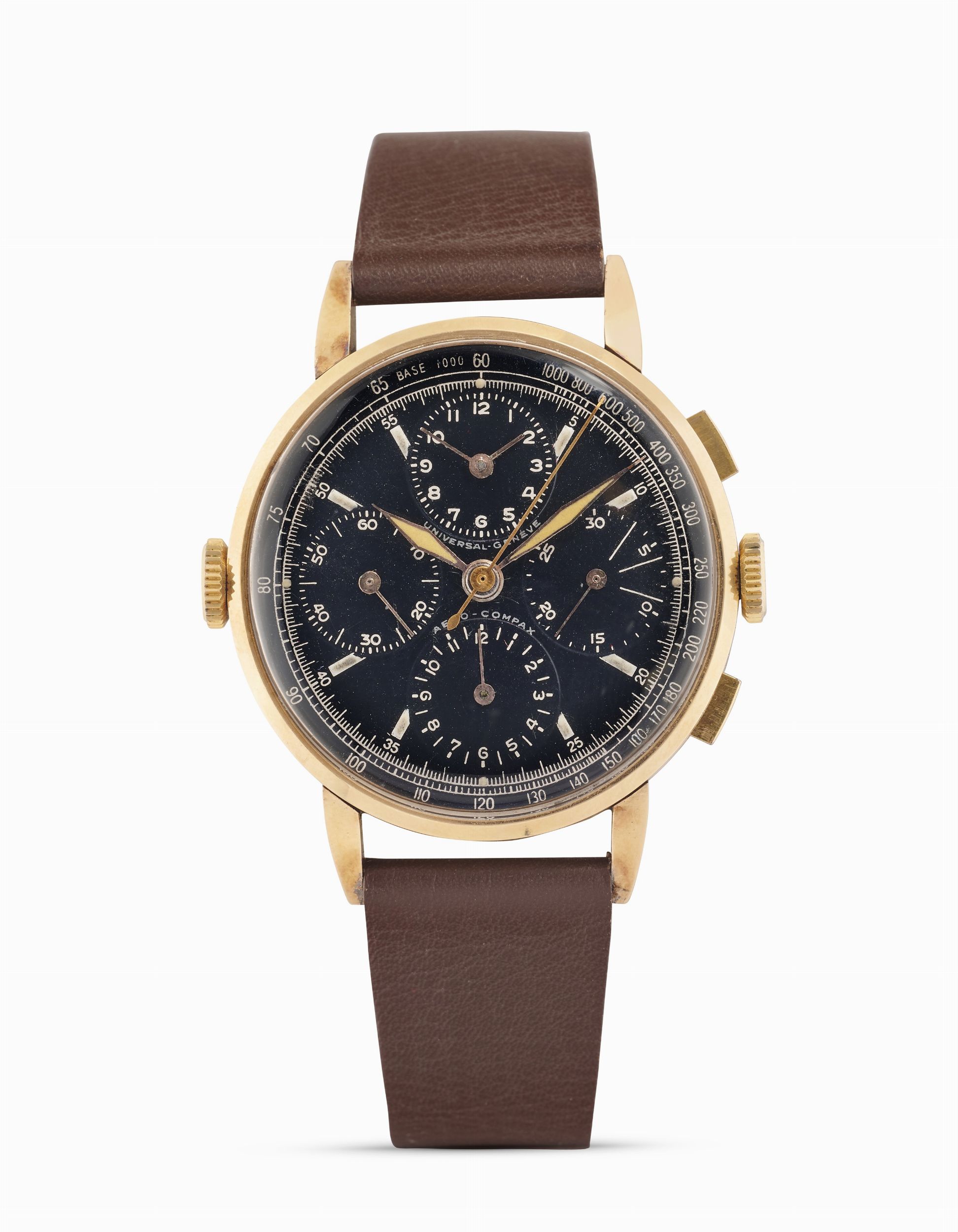 Cassa rotonda in oro rosa 18k, pulsanti rettangolari, anse ad artiglio.
