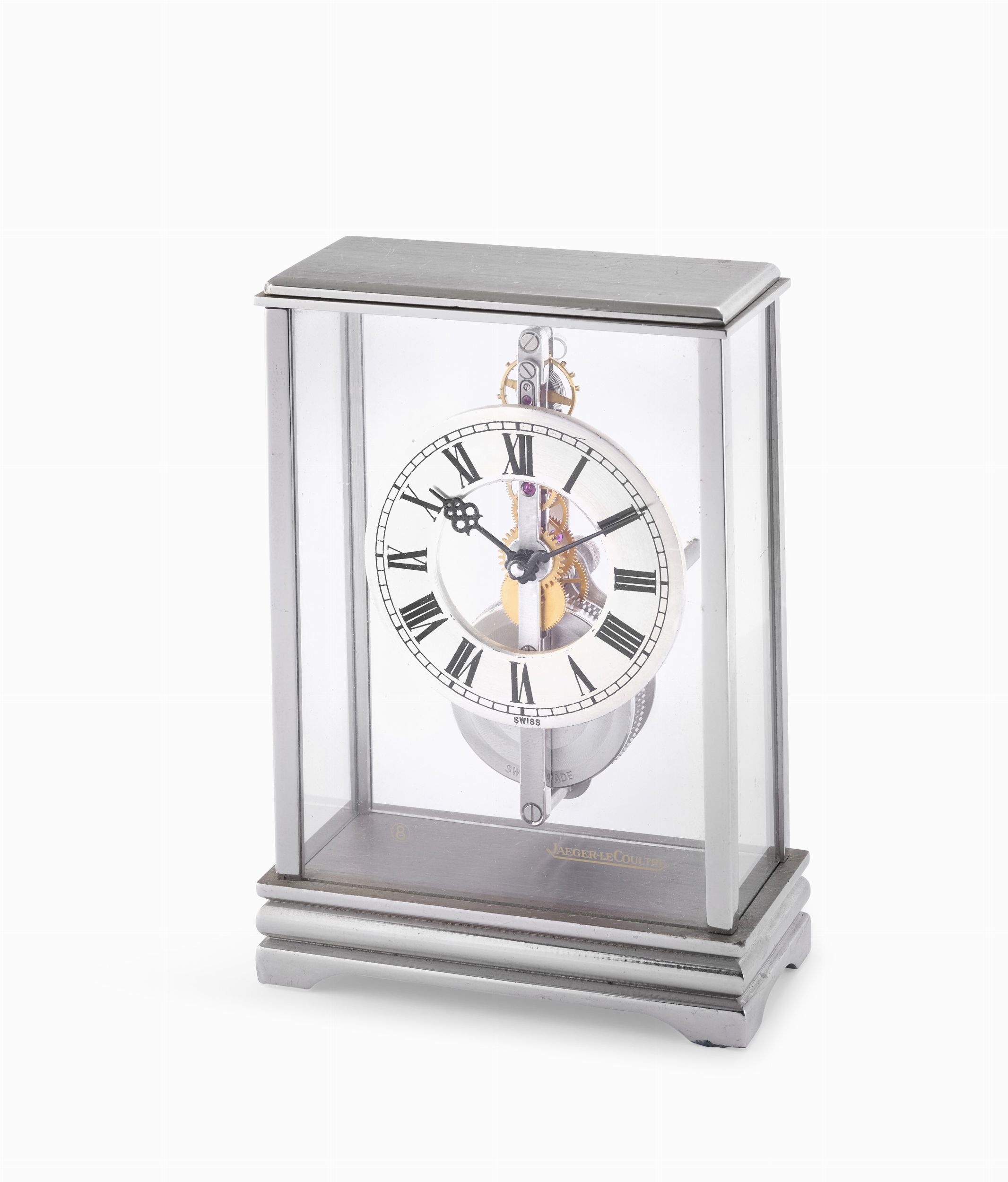 Quadrante scheletrato con fascia esterna argenté, numeri romani dipinti.