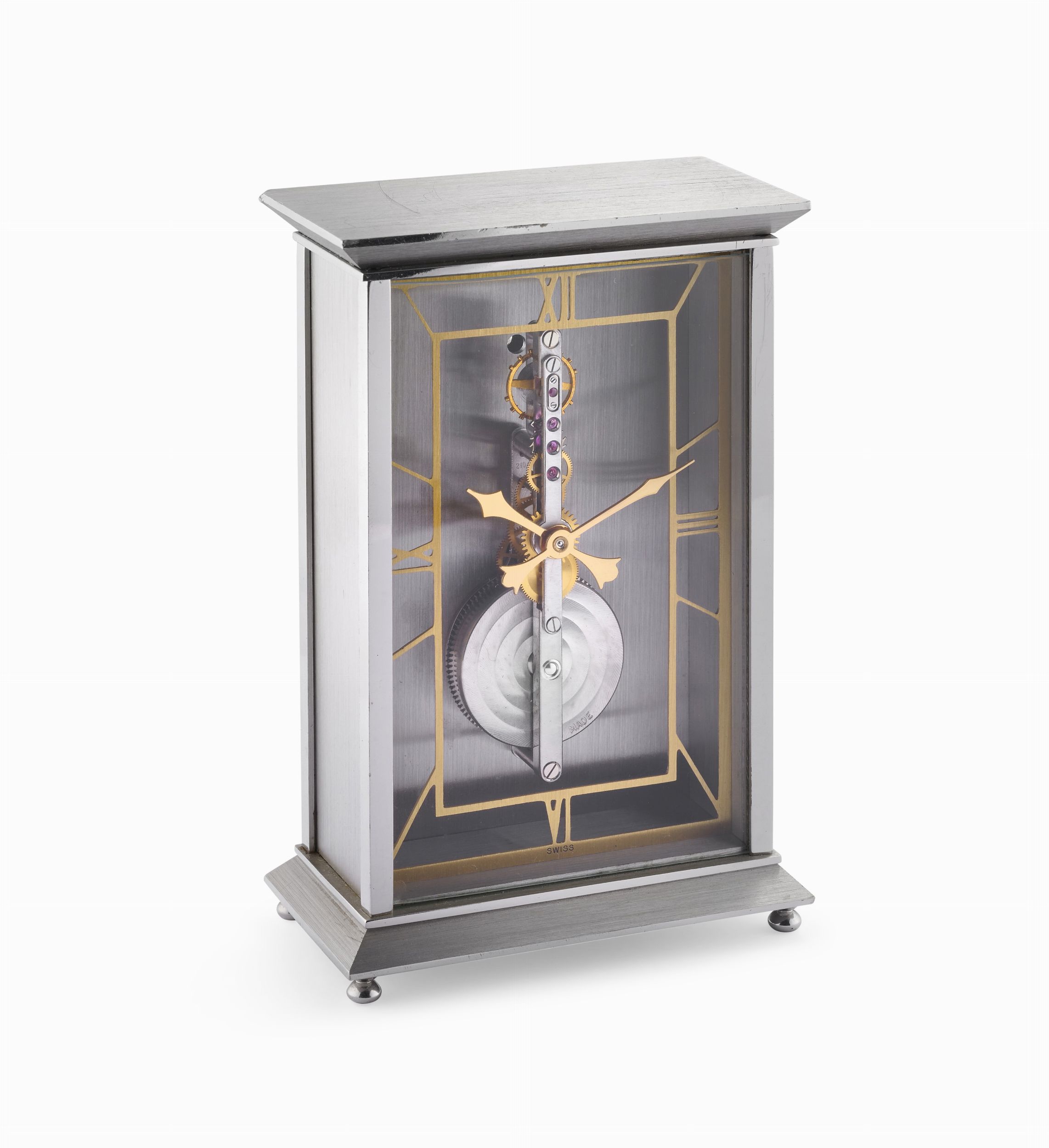 Quadrante scheletrato con fascia in ottone con numeri romani incisi.