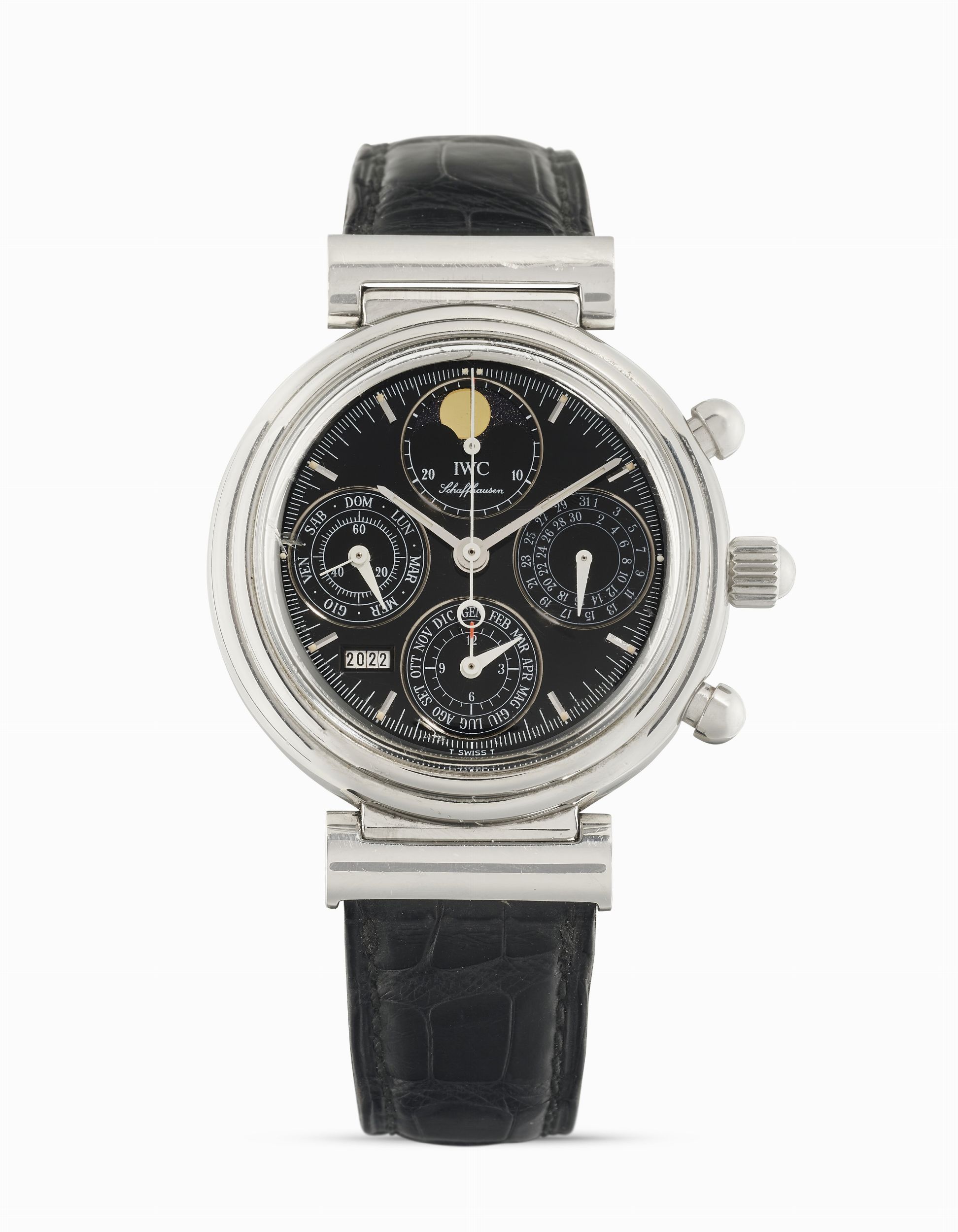 Quadrante nero, indici applicati, indicazione della data, giorno della settimana, mese, anno, fasi lunari e contatori cronografia.