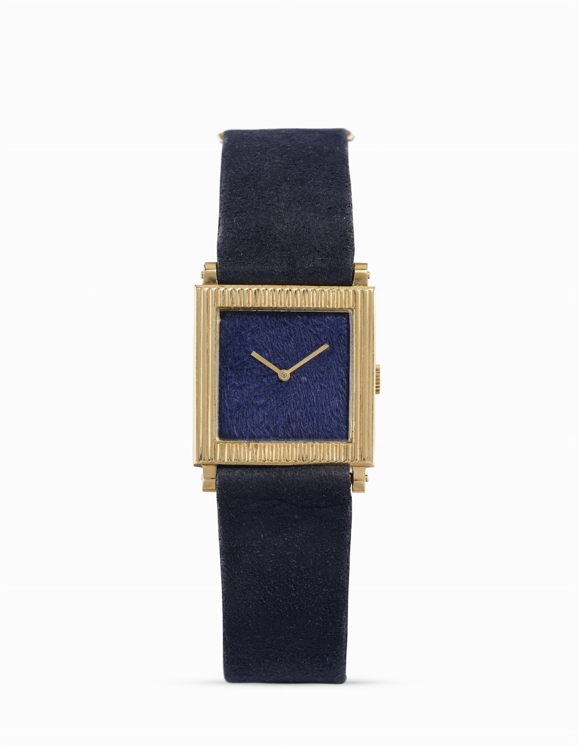 Cassa quadrata in oro 18k con finitura godronata, marchio inciso sul fondello.