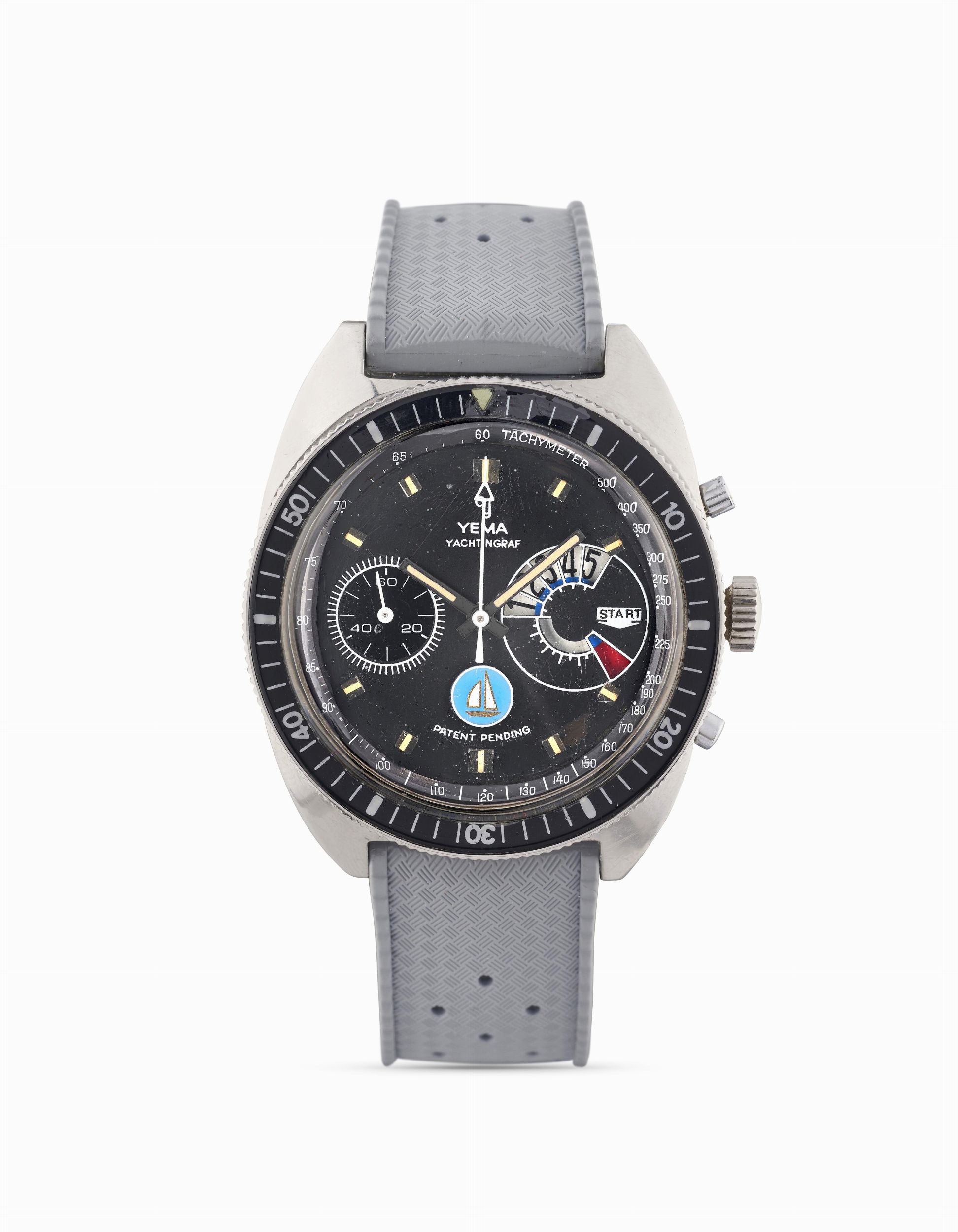 Quadrante nero, logo Patent Pending, contatore oversized per countdown regata, indici applicati luminescenti.