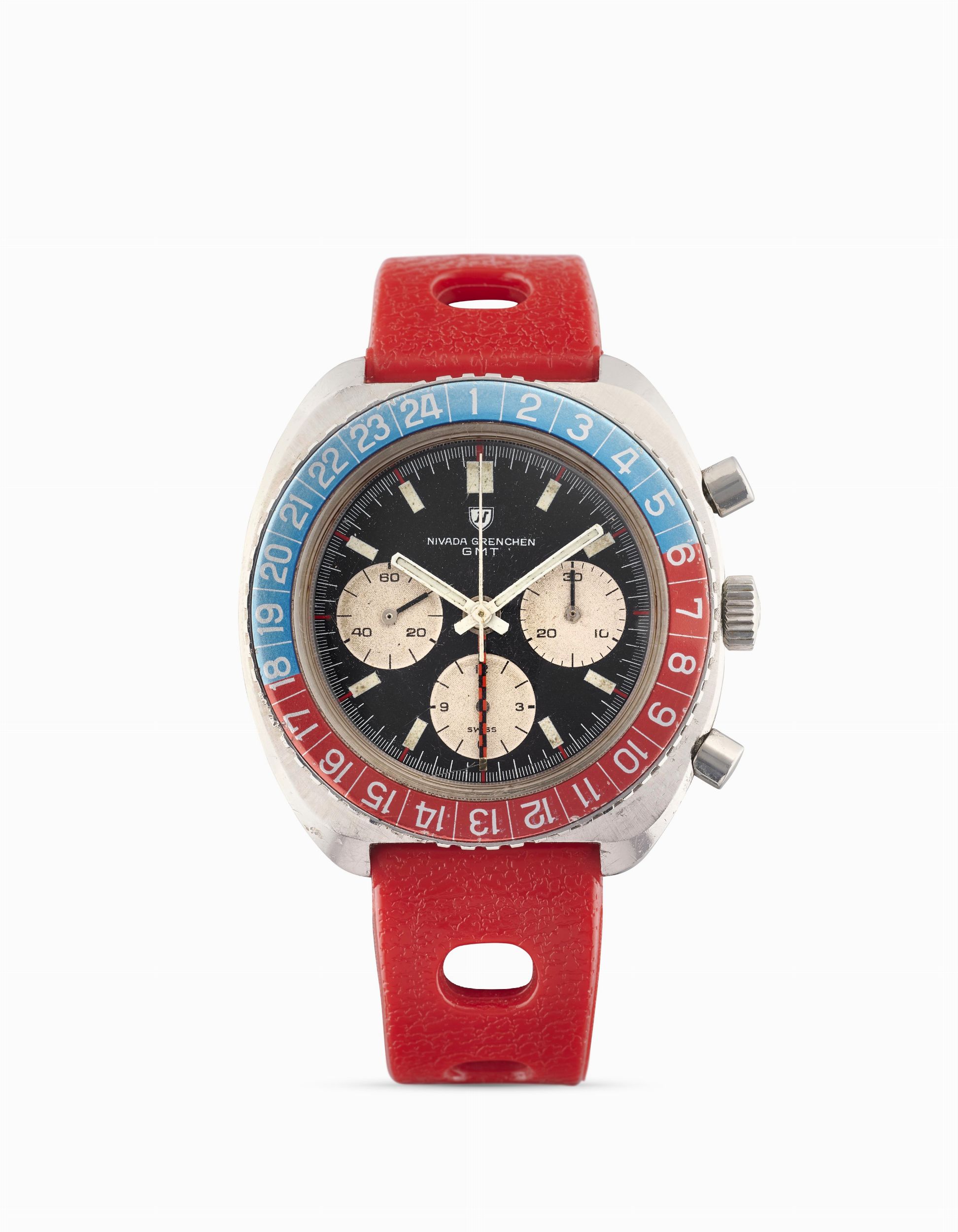 Cassa tonneau in acciaio, lunetta girevole blu e rossa in alluminio, pulsanti tondi.
