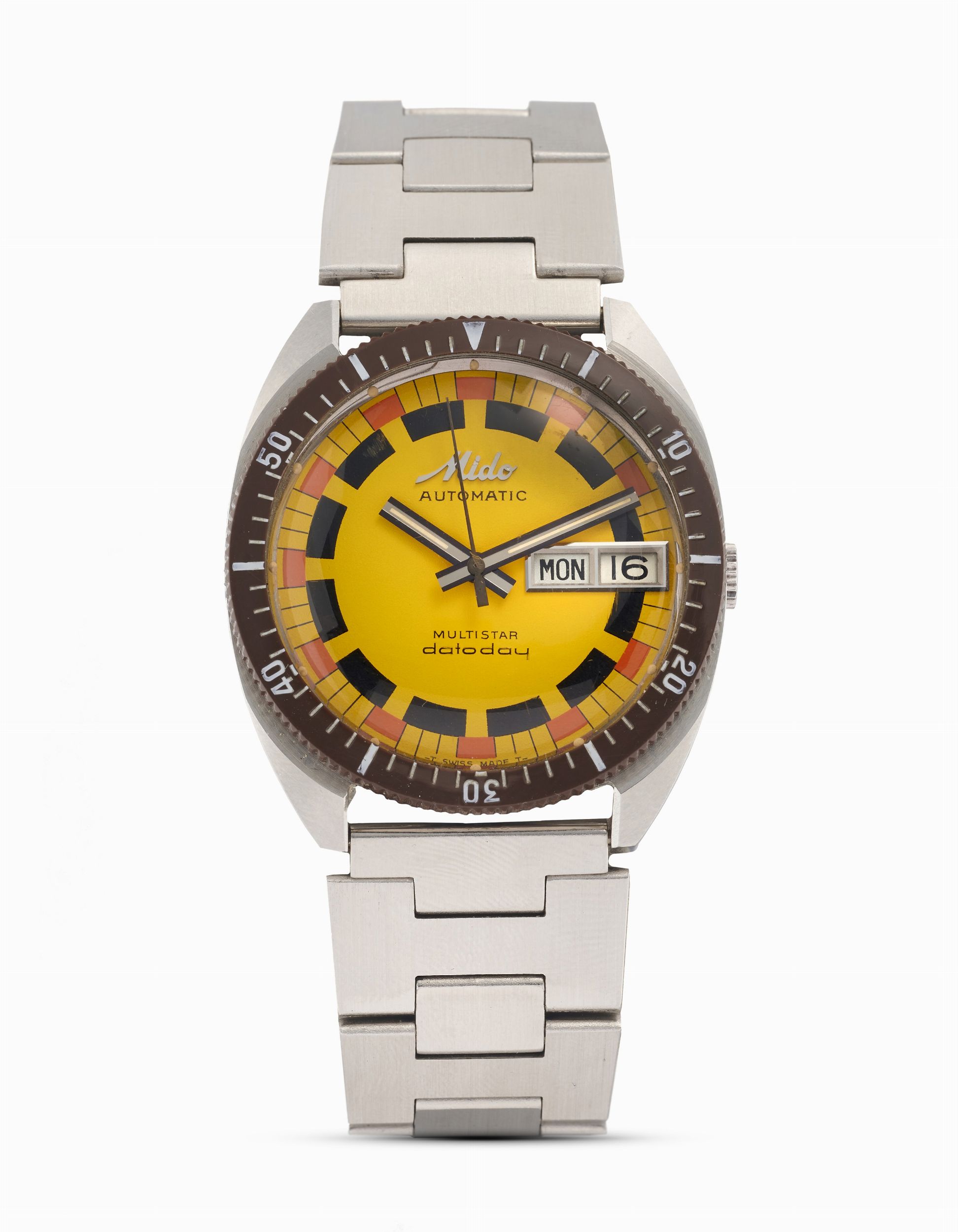 Quadrante giallo, nero e rosso, indici dipinti.